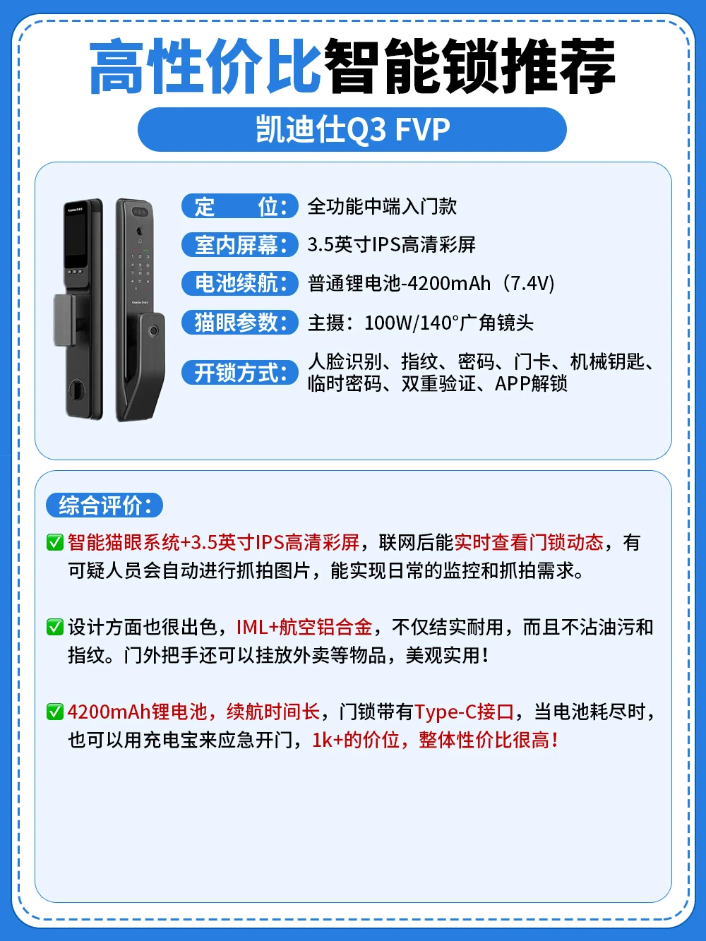 ▶️凯迪仕Q3 FVP:全功能中端入门款,8大解锁方式,拥有猫眼监控功能,搭配异常情况抓拍+逗留模式等,安全性高,航空铝合金面板搭配IML拉丝工艺,结实耐用,不沾油污与指纹,1k+的价位,性价比很高!