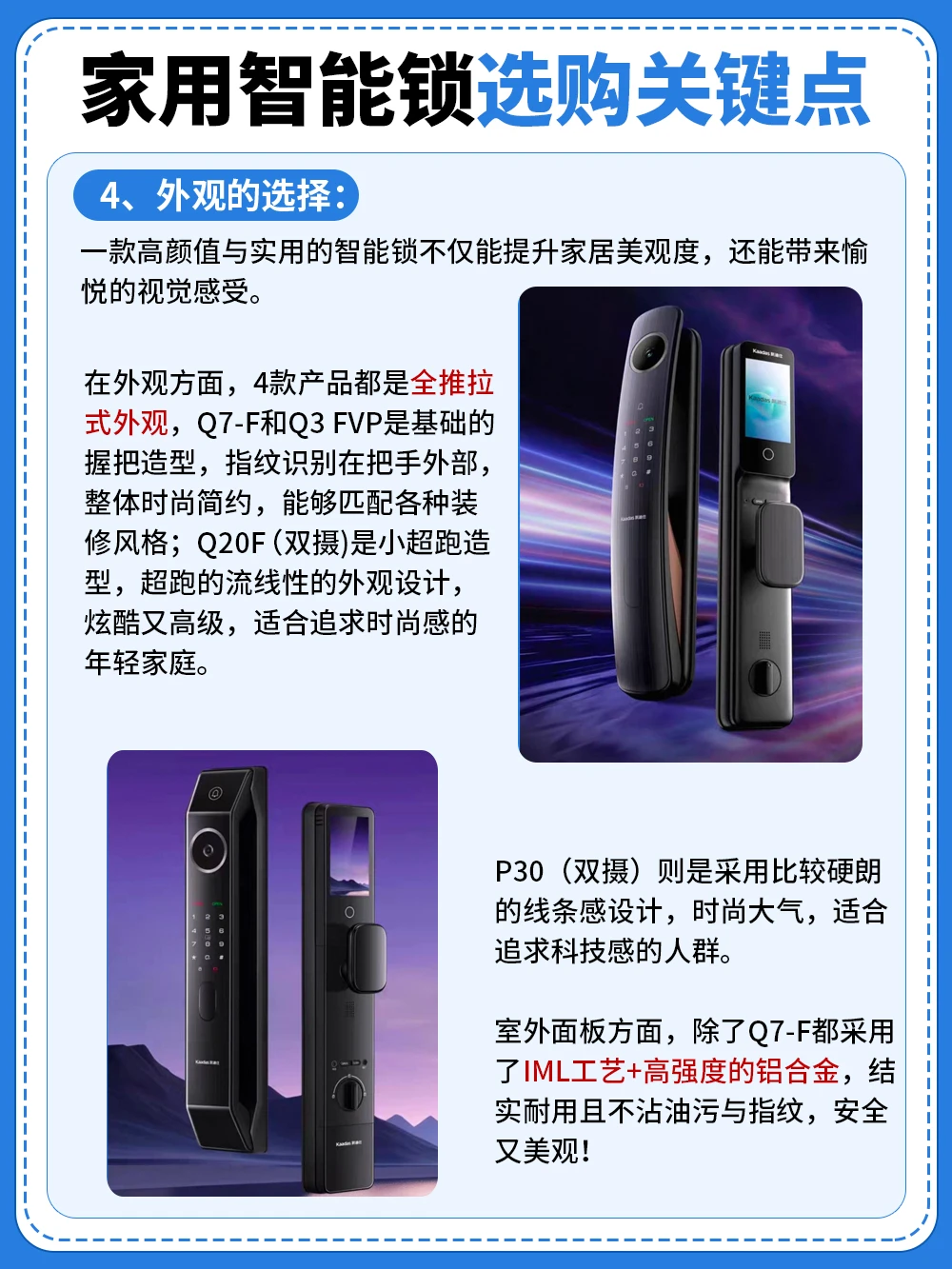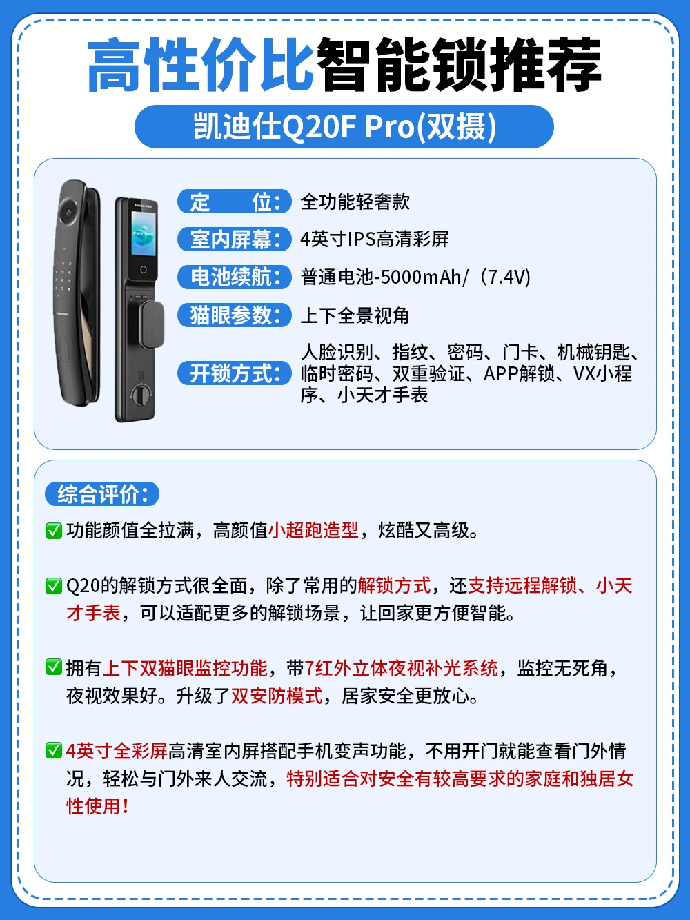 ▶️凯迪仕Q20F Pro(双摄):全功能轻奢款,高颜值小超跑造型+超全解锁方式,拥有上下双猫眼监控功能,带上下7红外立体夜视补光系统,监控无死角,夜视效果好,配备了室内可视大屏搭配变声功能,特别适合对安全有较高要求的家庭和独居女性使用。