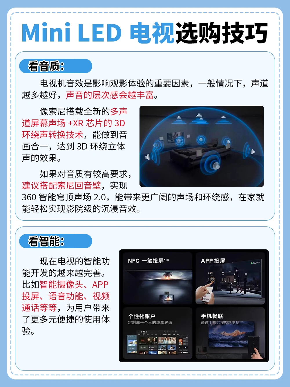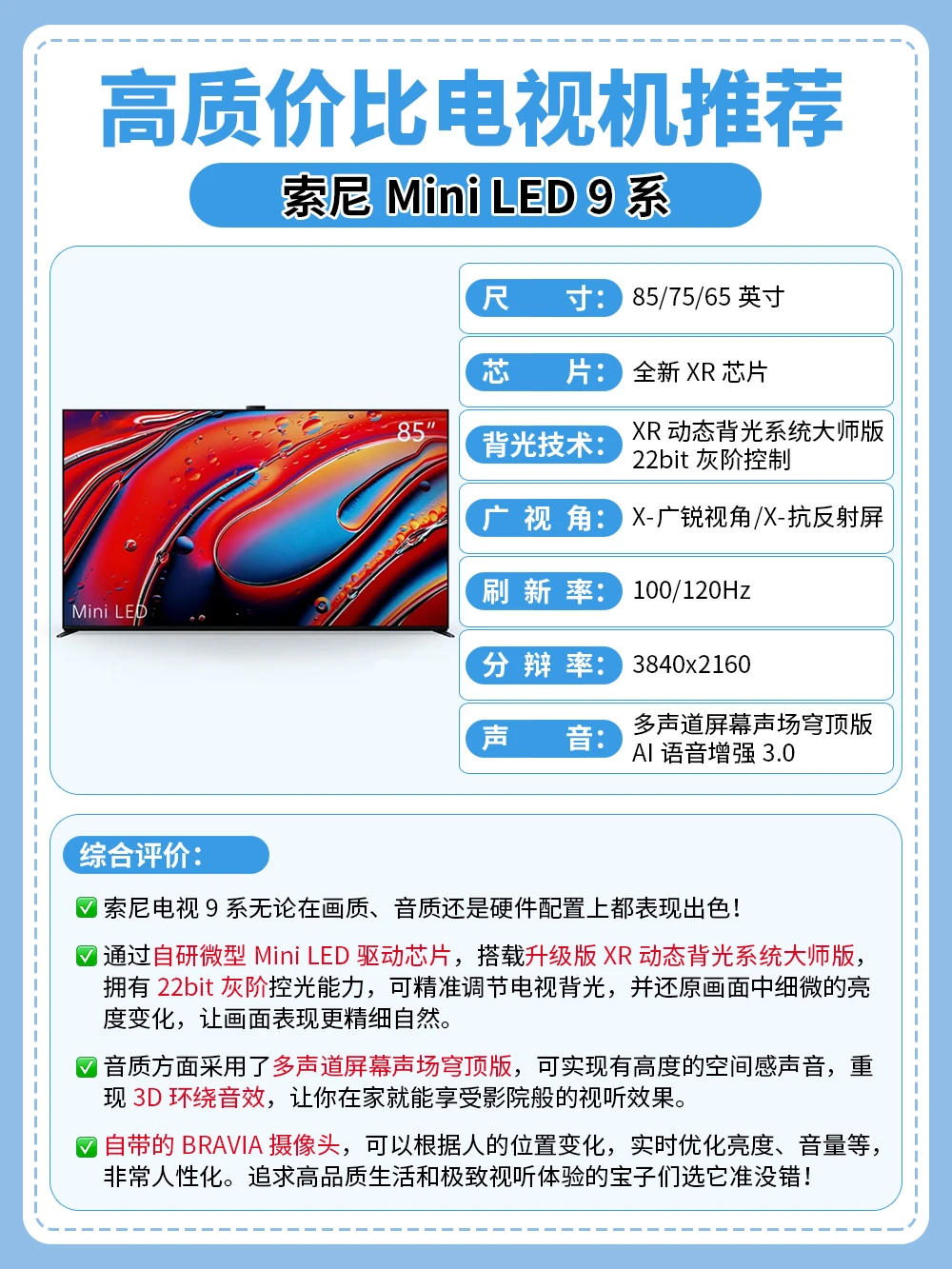 音质方面采用了多声道屏幕声场穹顶版,重现3D环绕音效,让你在家就能享受影院般的视听效果。还自带的BRAVIA摄像头,整体质价比超高,追求高品质生活和极致视听体验的宝子们选它准没错!