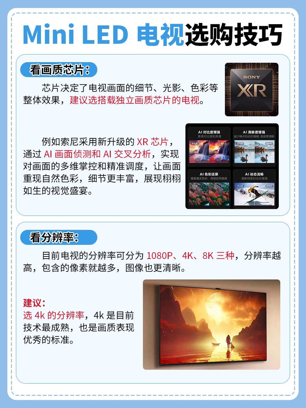 建议选4k的分辨率,4k是目前技术最成熟,也是画质表现优秀的标准。