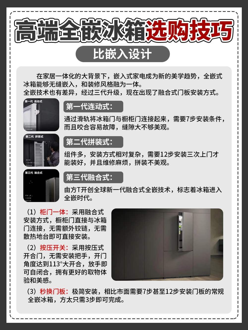 [赞R]相比市面需要7步甚至12步安装门板的常规全嵌冰箱,方太只需打孔、挂门、锁定三步就能轻松安装,非常省心‼️