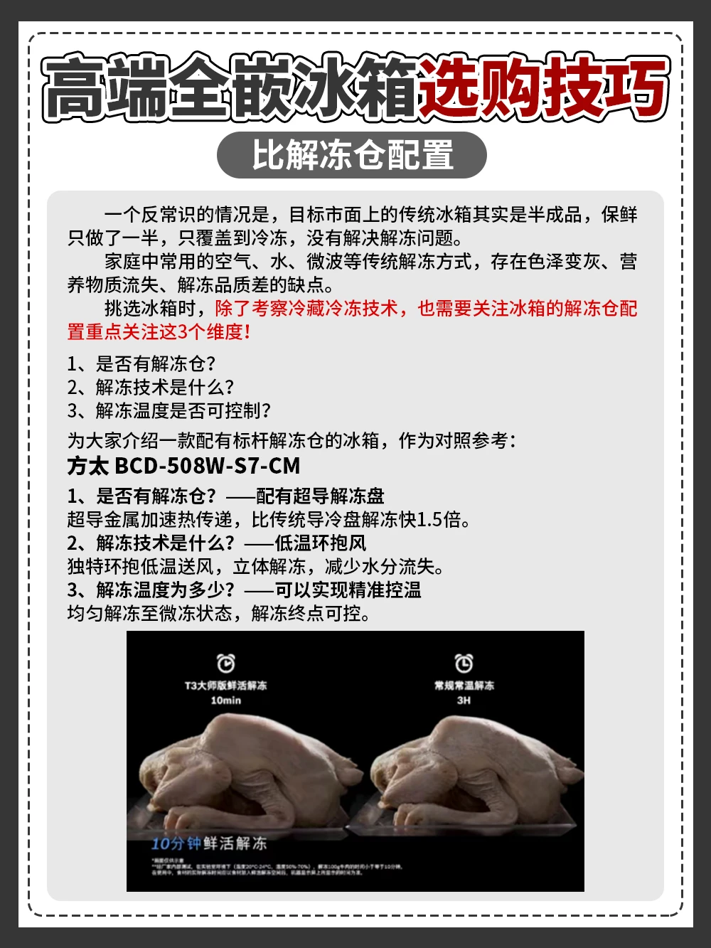 建议选有解冻舱配置的,如果有超导解冻盘更好,通过超导金属加速热传递,独特环抱低温送风,立体解冻,减少水分流失