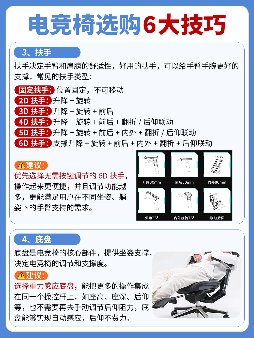 优先选择4D及以上的扶手,有联动功能更佳!调节方位越多,更能满足玩家在不同坐姿、躺姿下的手臂支持的需求。