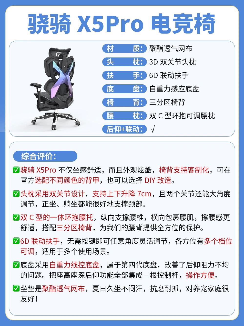 [斜眼R]今天给来大家分享一下我家在用的骁骑X5Pro电竞椅,不仅坐感舒适,而且外观炫酷,X椅背支持客制化,你可以去骁骑官方选配不同颜色的背甲还能自己DIY。头枕采用可升降+双关节旋转的设计,不管是正坐是躺坐,也能很好的支撑颈部,体验感非常好!