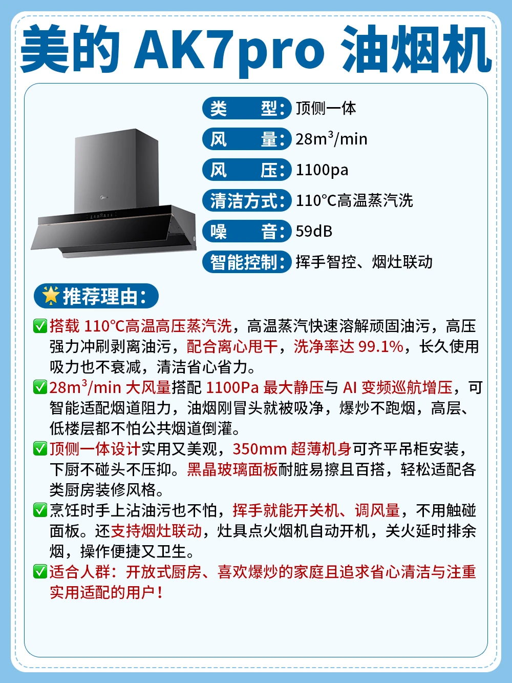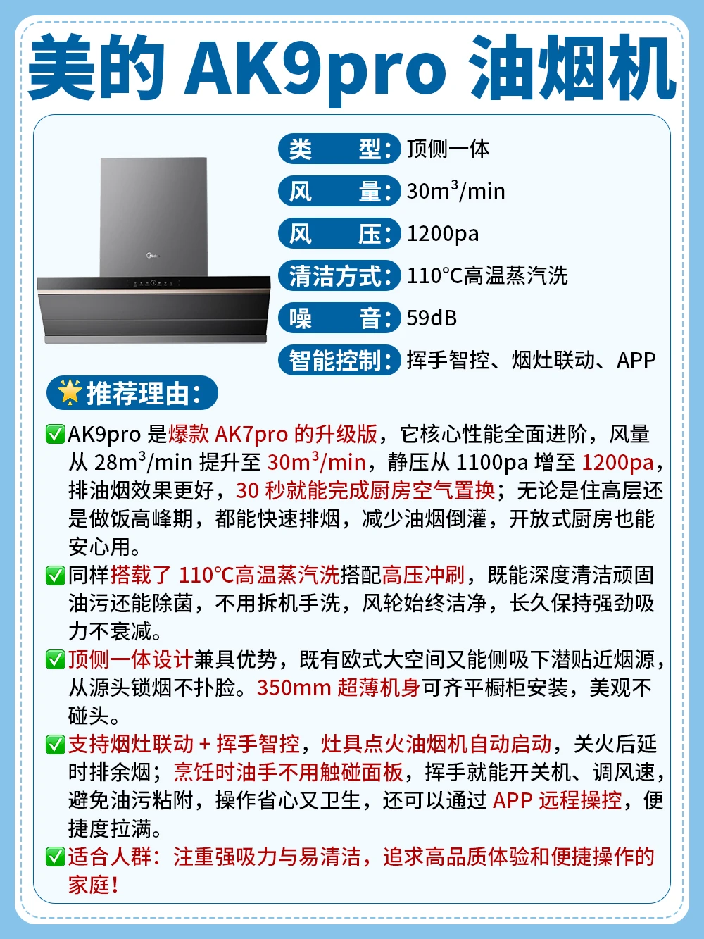 作为爆款AK7pro的升级版,它核心性能全面进阶,风量和风压等都做了优化升级,排烟吸油效果更好,30秒就能完成厨房空气置换;延续高温蒸汽洗技术,除菌除油更彻底,还新增APP远程操控功能,智能体验拉满,注重强性能与便捷智能的家庭可放心选。