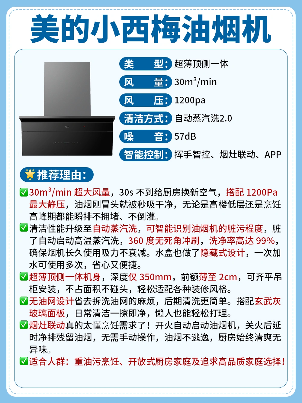 拥有28m³/min风量+1100Pa静压,日常炒菜、爆炒都能hold住,高层排烟不费劲。顶侧一体超薄机身齐平橱柜,110℃高温蒸汽洗功能能轻松溶解油污,长久使用吸力也不衰减,挥手智控+烟灶联动,操作便捷省心,开放式厨房、喜欢爆炒及追求高性价比的家庭可以选它。