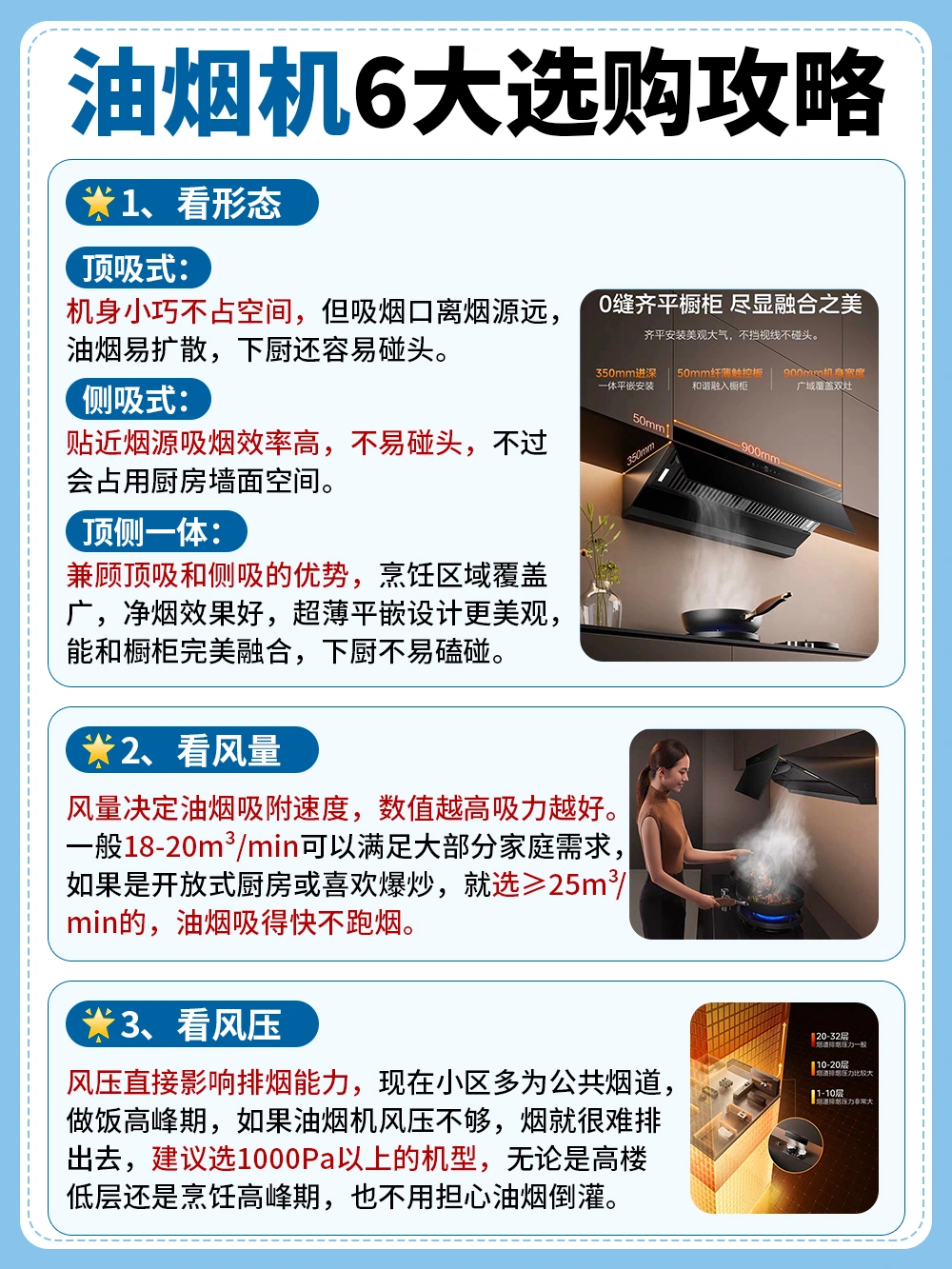 建议选1000Pa以上的机型,高楼低层或烹饪高峰期也不用担心油烟倒灌。