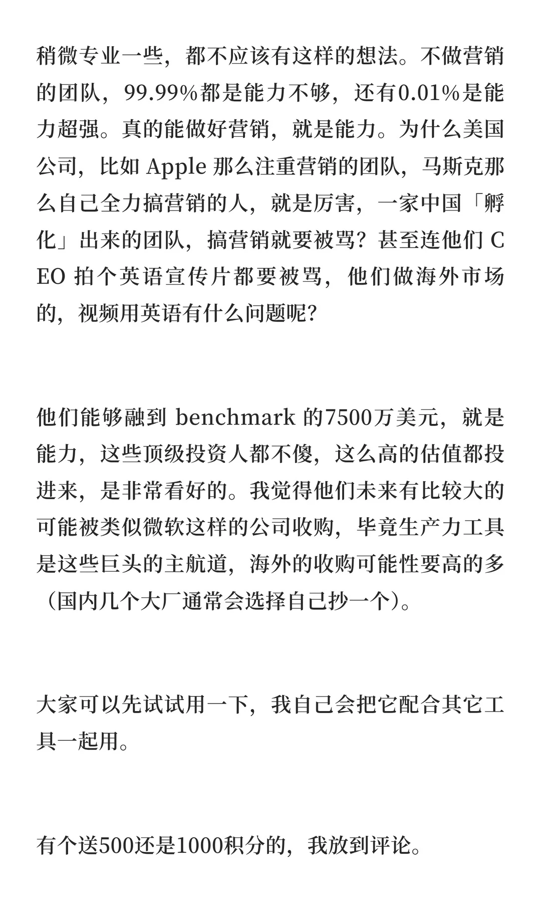 至于讨厌他们的点,比如说做营销,我觉得,但凡稍微专业一些,都不应该有这样的想法。不做营销的团队,99.99%都是能力不够,还有0.01%是能力超强。真的能做好营销,就是能力。为什么美国公司,比如 Apple 那么注重营销的团队,马斯克那么自己全力搞营销的人,就是厉害,一家中国「孵化」出来的团队,搞营销就要被骂?甚至连他们 CEO 拍个英语宣传片都要被骂,他们做海外市场的,视频用英语有什么问题呢?