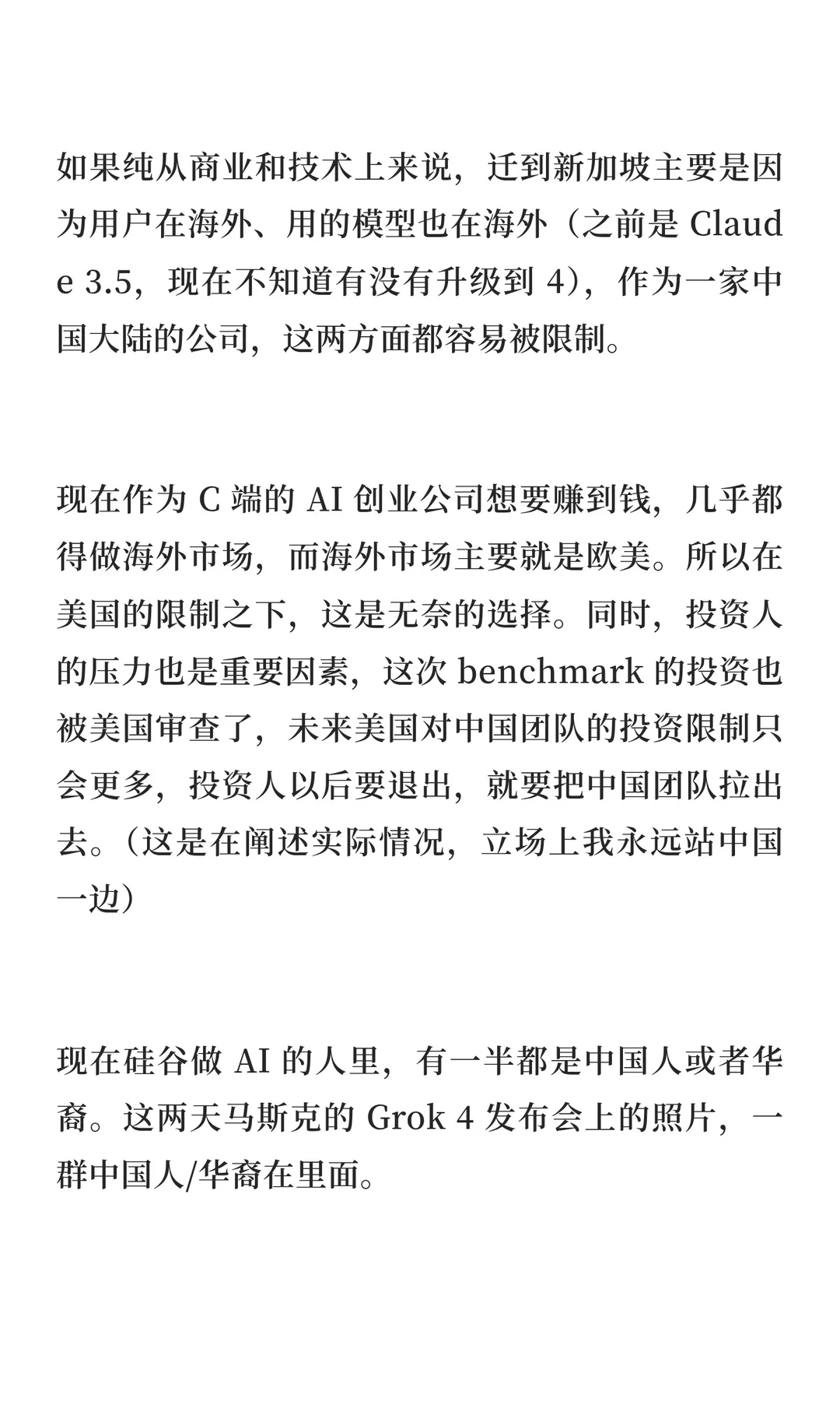 现在硅谷做 AI 的人里,有一半都是中国人或者华裔。这两天马斯克的 Grok 4 发布会上的照片,一群中国人/华裔在里面。