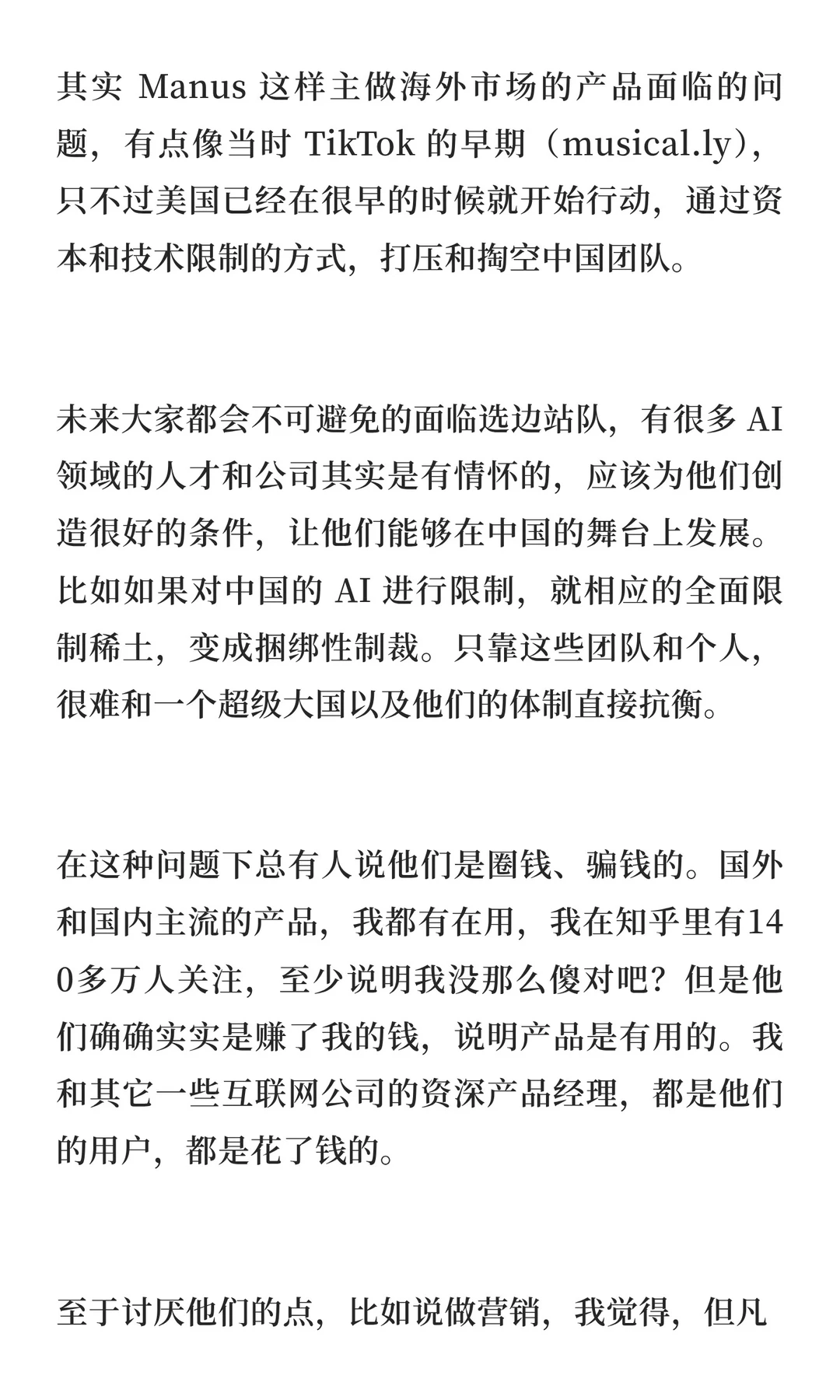 其实 Manus 这样主做海外市场的产品面临的问题,有点像当时 TikTok 的早期(musical.ly),只不过美国已经在很早的时候就开始行动,通过资本和技术限制的方式,打压和掏空中国团队。