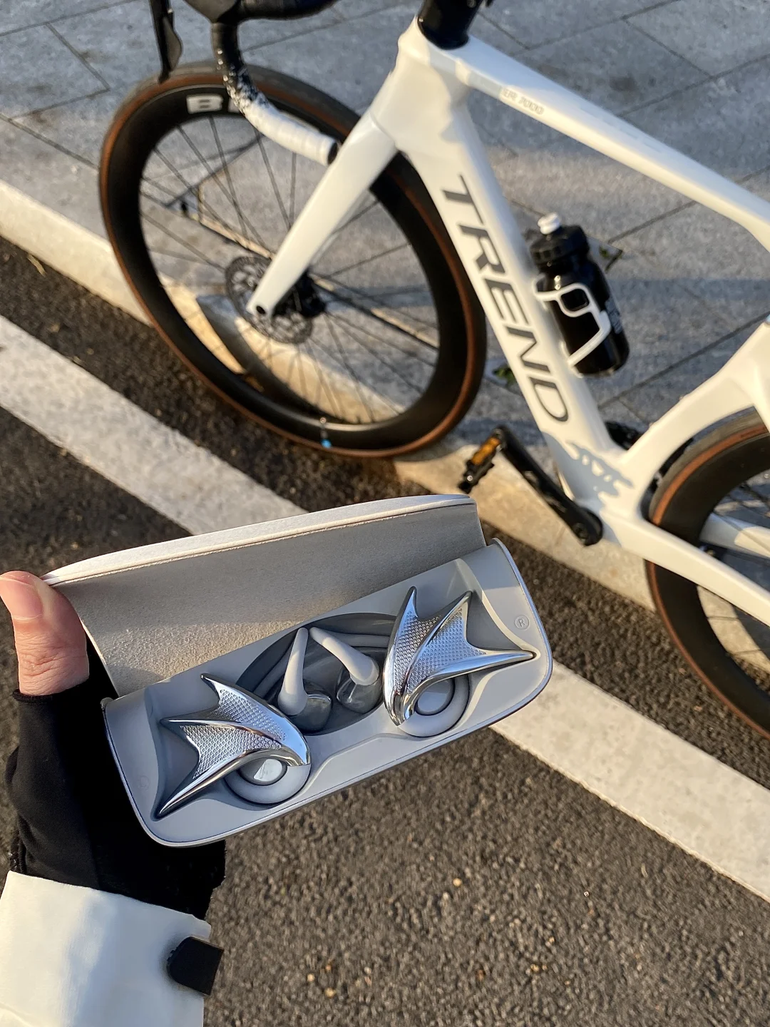而且这耳机的颜值真的长在我的审美点上,翼造型的设计还拿了设计双金奖,银翼的金属质感和我的公路车轻奢运动适配感直接拉满。
