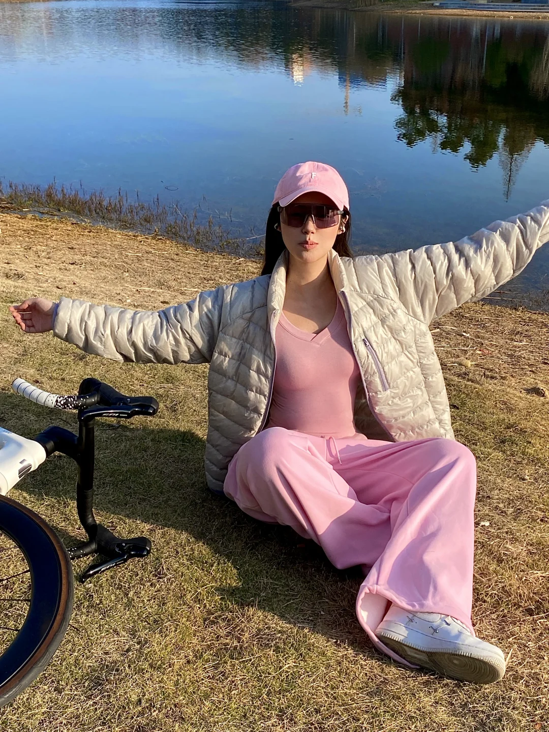江边骑完车坐在草地上晒晒太阳,羽绒服的保暖性也在线,不会因为薄就不抗冻,口袋的拉链设计还能放手机钥匙,细节拉满~