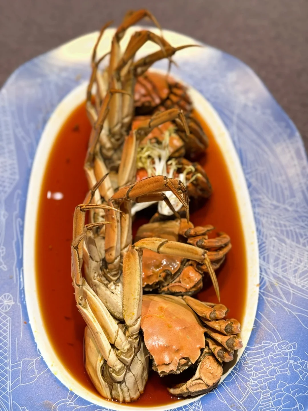 风味:陈年花雕酒的醇厚酒香完全渗透进蟹肉,入口先是冰凉鲜甜,接着酒香在舌尖散开,最后留下绵长回甘口感:蟹肉紧实饱满,蟹黄绵密流金,完全没有腥味,是本帮冷菜的经典之作。