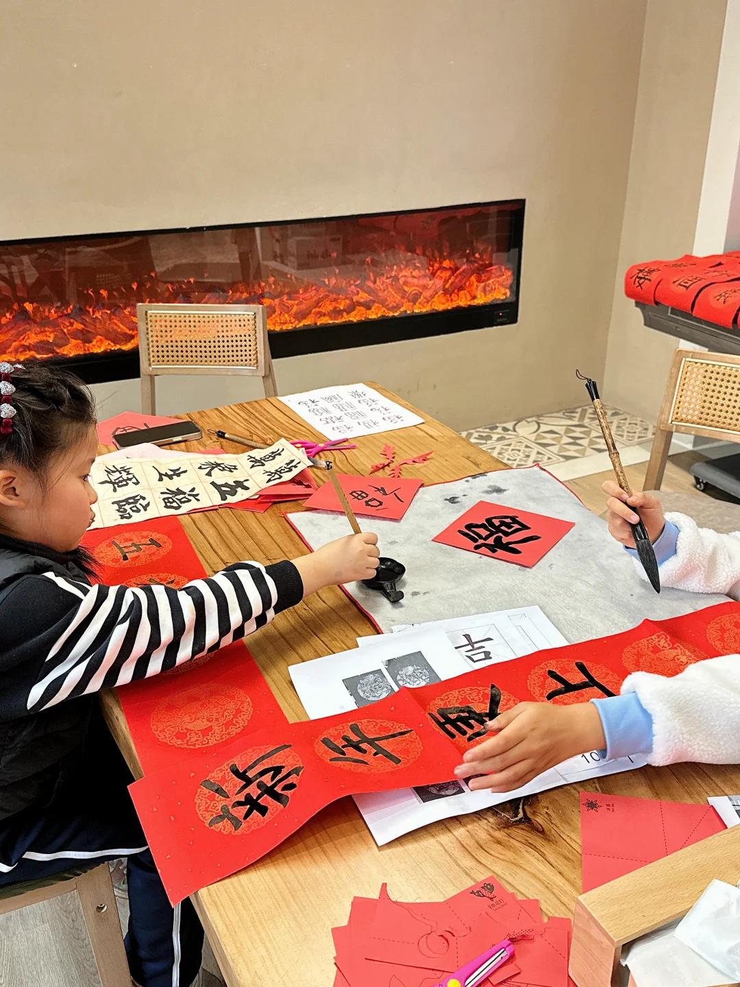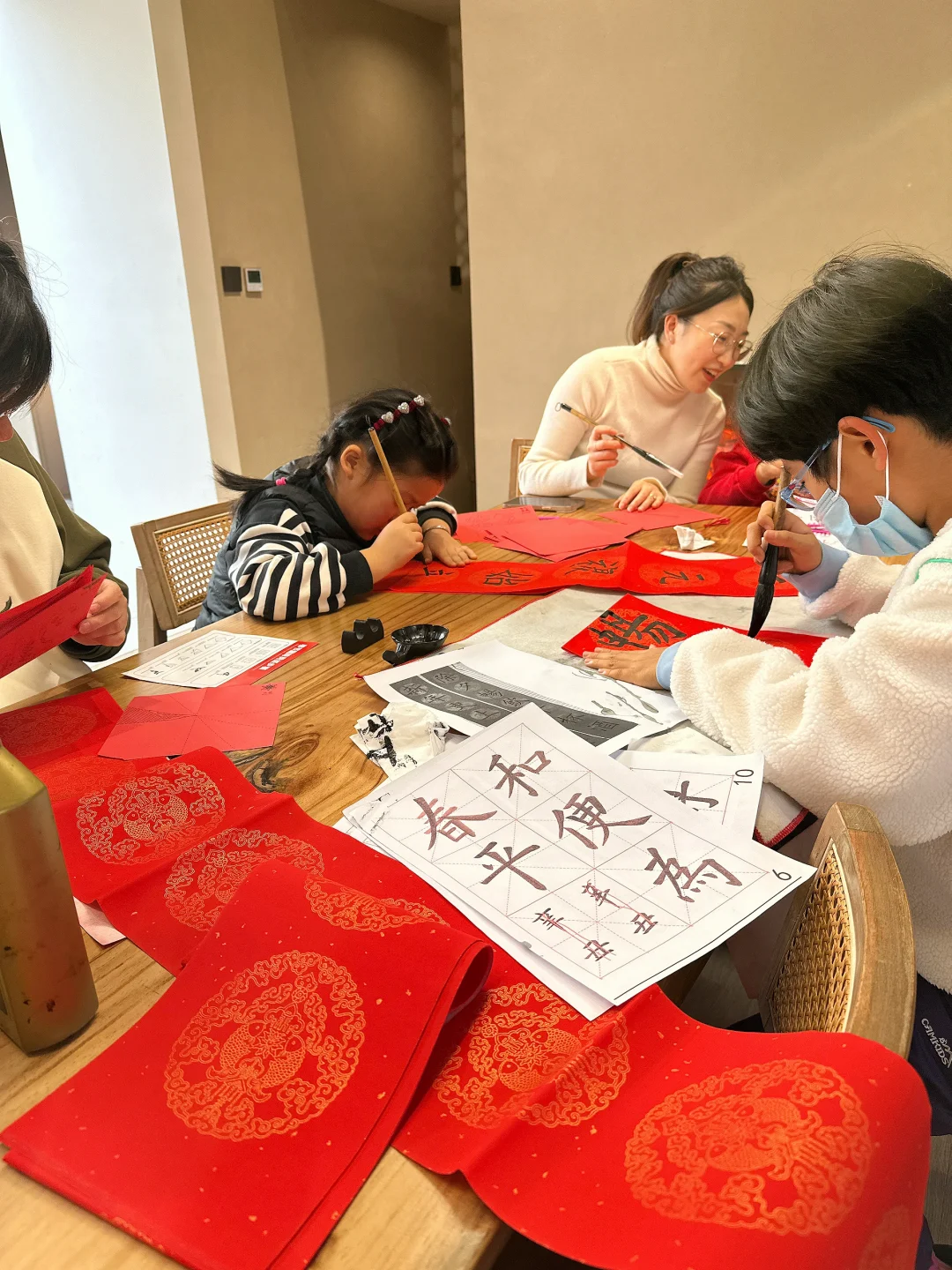 🔸红纸铺满长桌,全家一起研墨写福。孩子的“抽象派”春联贴上门框,怎么看都是最顺眼的年画 🧧🖌️
