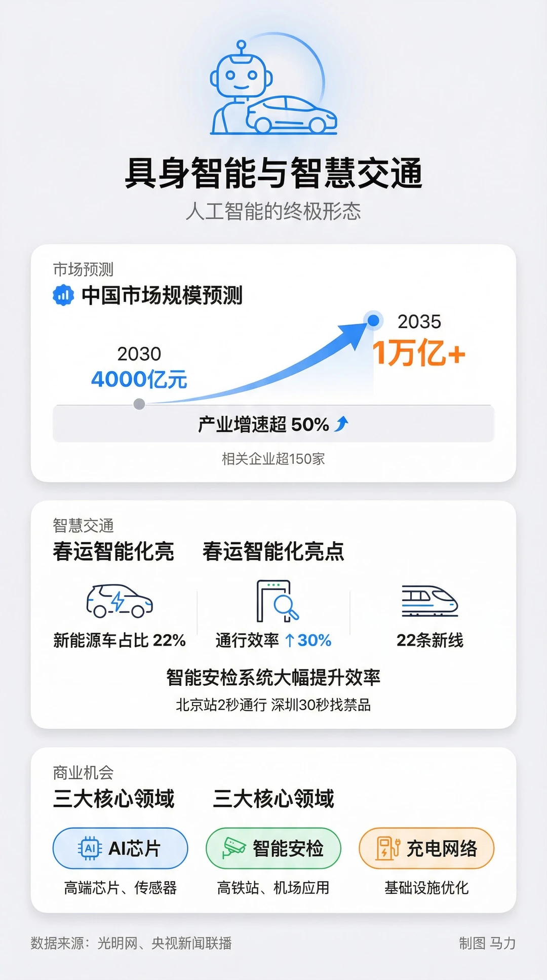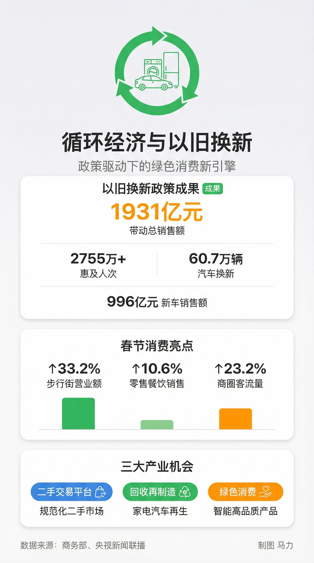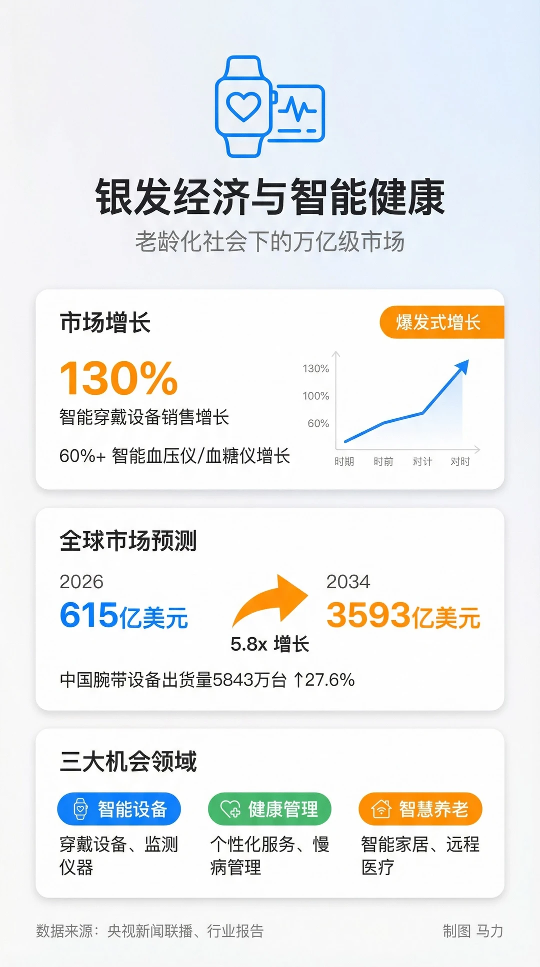 我用 AI 给大家梳理了2.17新闻联播背后的商业机会:银发经济:老年人的钱最好赚?智能手表、血压仪、血糖仪,这些健康设备的销售额涨了130%。老年人开始用智能设备管理健康了。不是买来摆着,是真的在用。全球市场规模,2026年是615亿美元,到2034年能到3593亿。翻了将近6倍。中国的腕带设备出货量涨了27.6%,有5843万台。机会在哪?做智能设备的公司有机会,做健康管理服务的也有机会。远程医疗、智能家居、慢病管理,都在往这个方向走。以旧换新:政策红利还能吃多久春节期间,以旧换新政策带动了1931亿元的销售额。60.7万辆车完成了以旧换新,新车销售额996亿。步行街的营业额涨了33.2%,零售餐饮涨了10.6%。这波红利不只是卖新车新家电。二手交易平台在规范化,回收再制造的产业链在建立。做二手市场的,做循环经济的,现在是好时机。具身智能:机器人要来了具身智能,就是能动的AI。不只是聊天,还能干活。2030年中国市场规模4000亿,2035年能破万亿。产业增速超过50%。春运期间,智能安检系统让通行效率提升了30%。北京西站2秒通过,深圳北站30秒就能找到违禁品。新能源车的春节占比已经到了22%。充电网络在铺,智能交通在建。AI芯片、传感器、智能安检设备,这些都是刚需。文旅融合:县城也能年入千亿县域旅游订单涨了51%,酒店住宿涨了32.7%,冰雪游涨了120%。现在有70多个县,年旅游收入超过千亿。成都的熊猫IP,每天上万人打卡。宠物消费市场3126亿,IP授权市场也是千亿级别。不只是大城市有机会。县城的特色民宿、文创产品、数字营销,都在起量。小地方也能做出大生意。