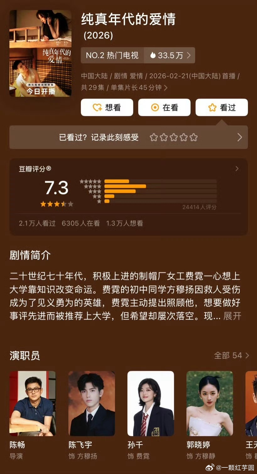 陈飞宇 纯真年代的爱情酷云全端破亿!!某瓣开分7.3!绝对低了,可以起码8分的