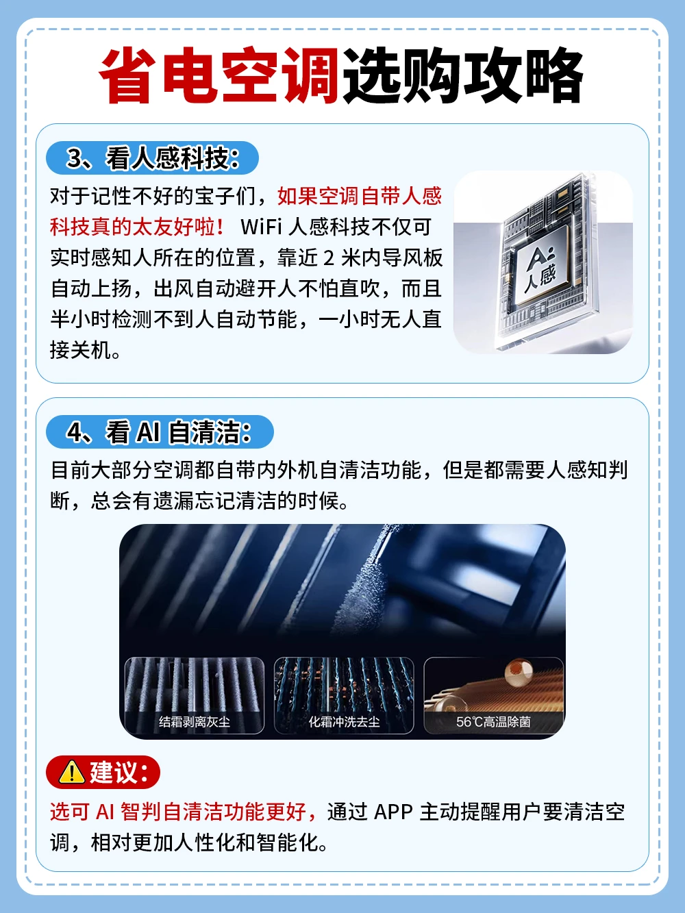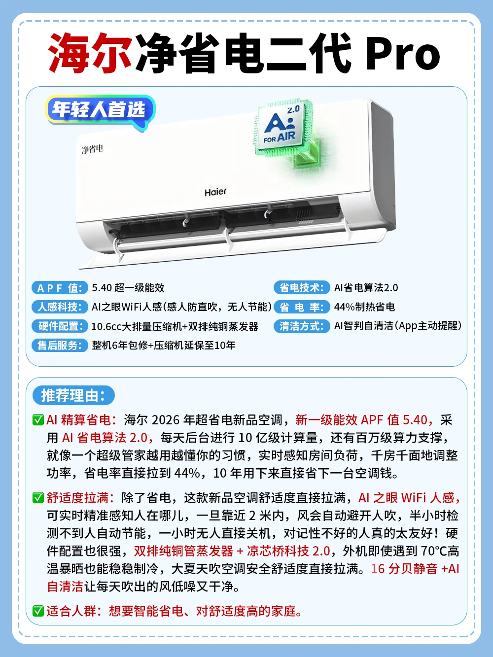 ✅舒适度拉满:除了省电,这款新品空调舒适度直接拉满,AI之眼WiFi人感,可实时精准感知人在哪儿,一旦靠近它2米内,风会自动避开人吹,半小时检测不到人自动节能,一小时无人直接关机,对记性不好的人太友好!硬件配置也很强,双排纯铜管蒸发器+凉芯桥科技2.0,外机遇到70℃高温暴晒也能稳稳制冷,大夏天吹空调安全舒适度直接拉满。16分贝静音+AI自清洁让每天吹出的风低噪又干净。