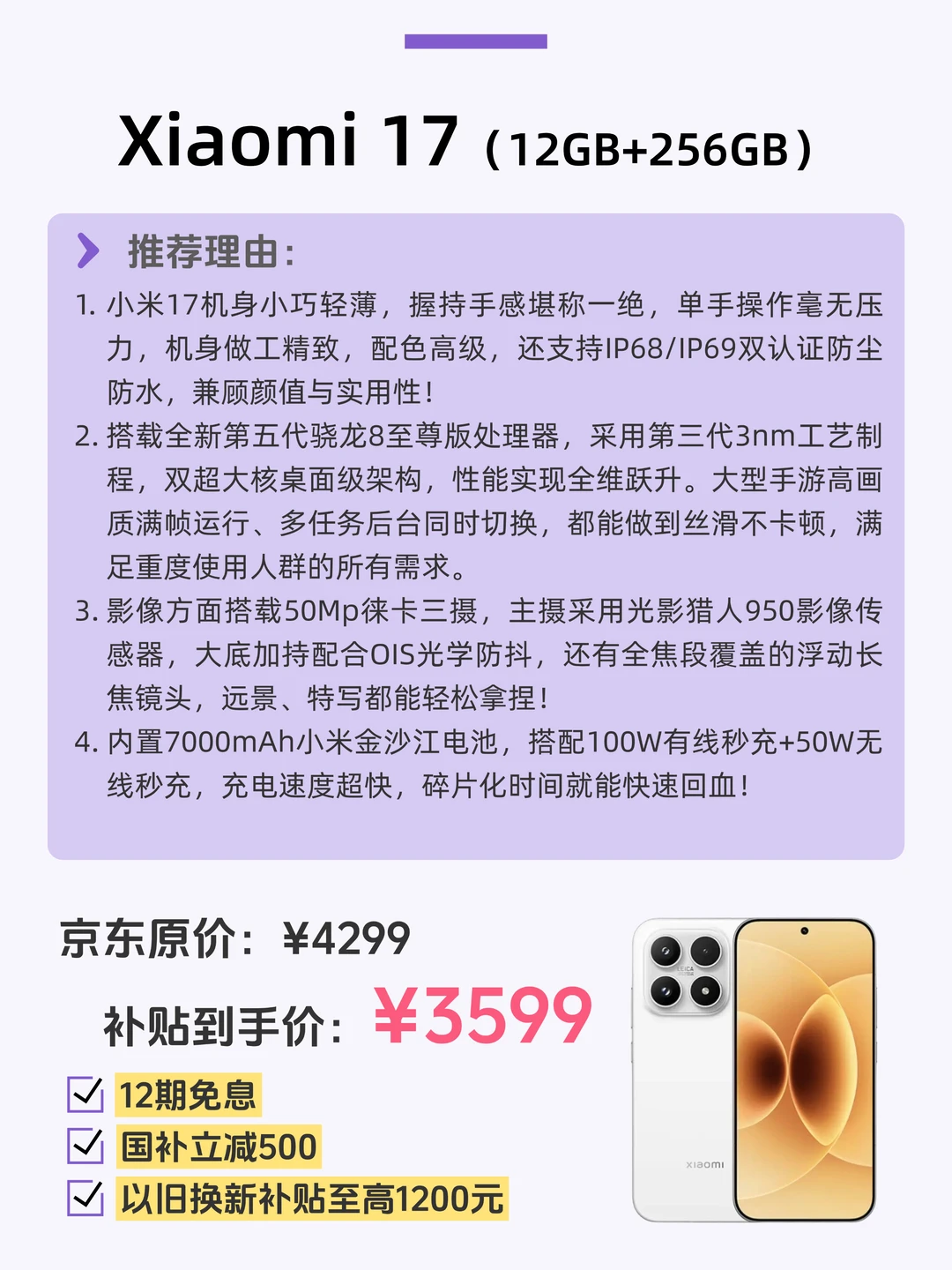 👉我最心动的就是Xiaomi 17📱,这次活动直接立省大几百,性价比直接拉满!作为小屏旗舰的标杆,它搭载第五代骁龙8至尊版处理器,性能拉满,高帧手游、重度多任务都丝滑稳定。7000mAh大电池搭配百瓦澎湃快充,徕卡专业光学三摄,全场景随手拍出质感大片,轻薄机身握持感舒适,IP68防尘防水加持,颜值实力双在线。这次活动国补立减500元,还有12期免息,以旧换新补贴至高1200元!