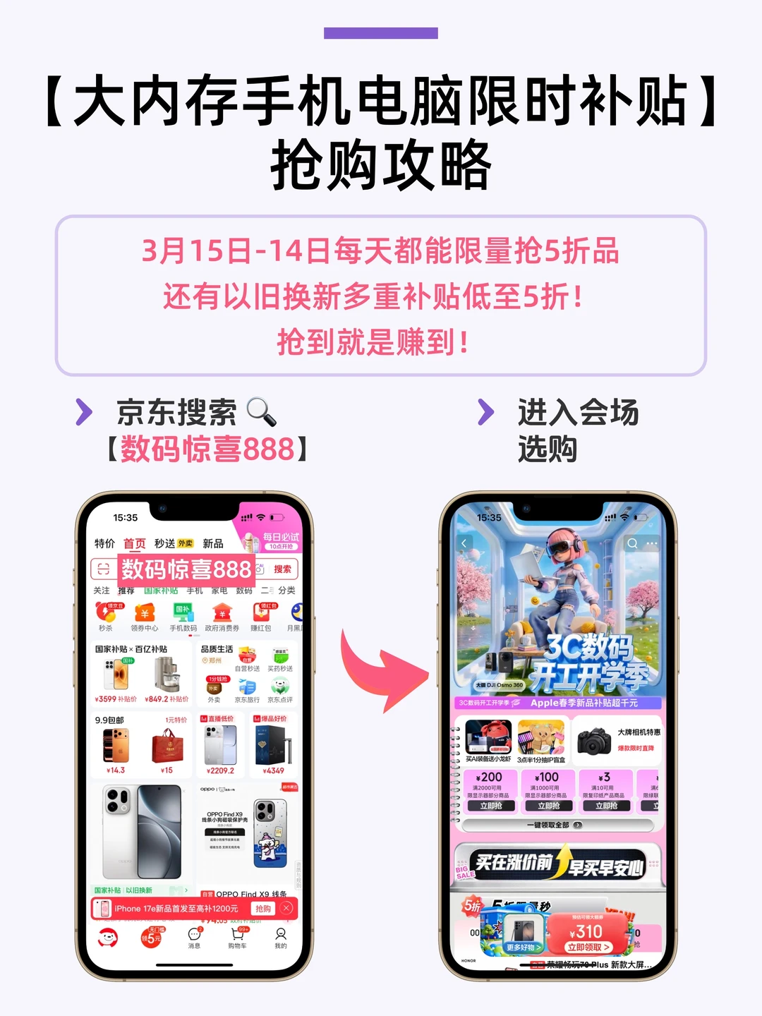 3月5日-14日,📓每天都能限量抢5折品,还有以旧换新叠多重补贴5折起呢!真的是买在涨价前,早买早安心,不用等涨价了再肉疼。