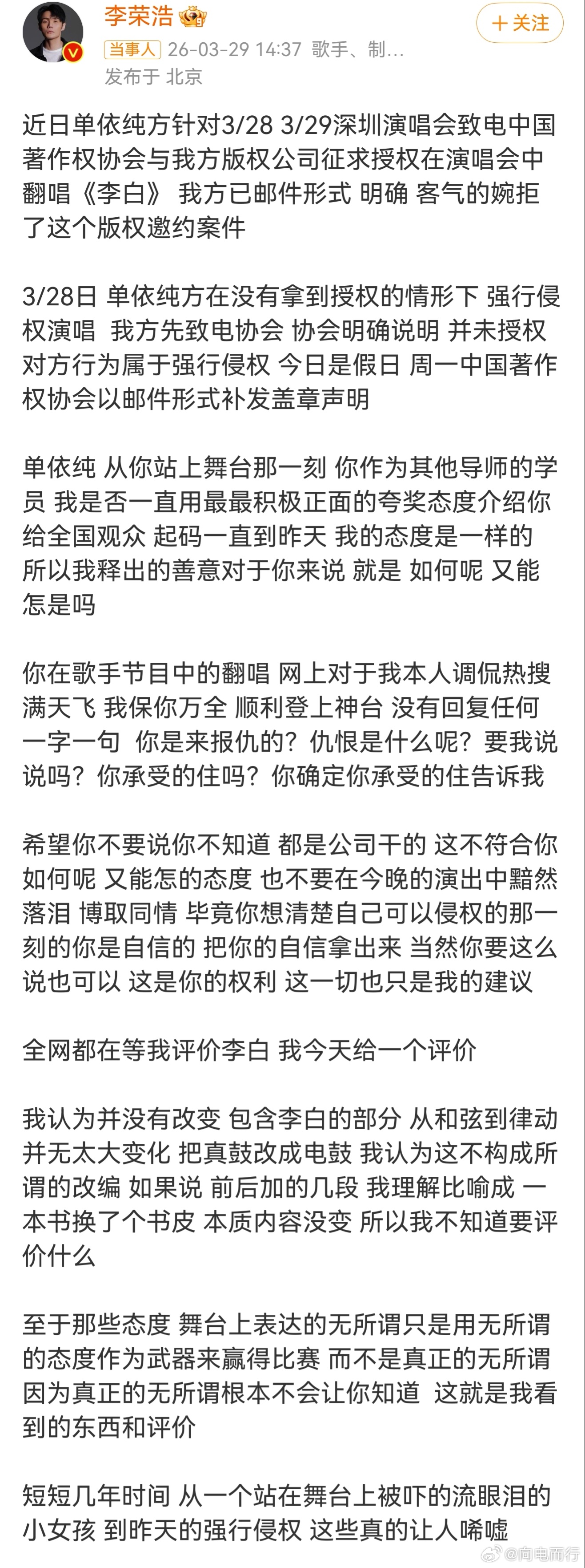 李荣浩 单依纯强行侵权