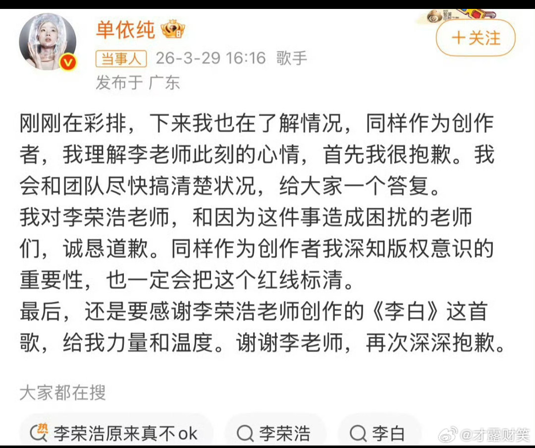 单依纯改编李荣浩公开维权单依纯改编侵权一事,并非小心眼,更不是针对性别或年龄,而是对音乐版权与原创心血的正当守护。音乐本就不分男女、不分资历,侵权就是侵权,任何创作者都有权维护自己的作品。对创作型歌手而言,每首歌都是倾注无数熬夜、闭关与心血打磨的“孩子”,是最珍视的成果。正常改编本是对作品的再诠释,可是现在忽视了原作的情感与内核。李荣浩的发声,从不是斤斤计较,而是在坚守音乐行业最基本的底线:尊重原创、敬畏版权。只有创作者敢于维护自身权益,行业才能尊重创作、善待原创。他这波维权合情合理,非但没错,反而值得肯定,期待他们和平解决。单依纯改编