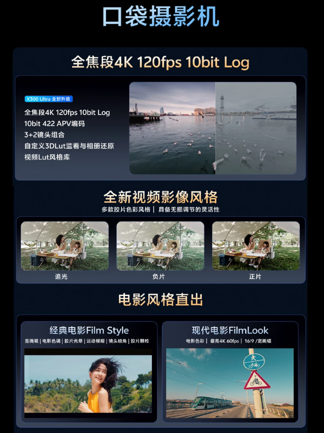 🎥视频方面更是支持了全焦段 4K 120fps 10bit、全焦段杜比视界、全焦段光学防抖,说是口袋摄影机也不为过。还内置了2款电影风格包,人人都可以做生活的导演!!