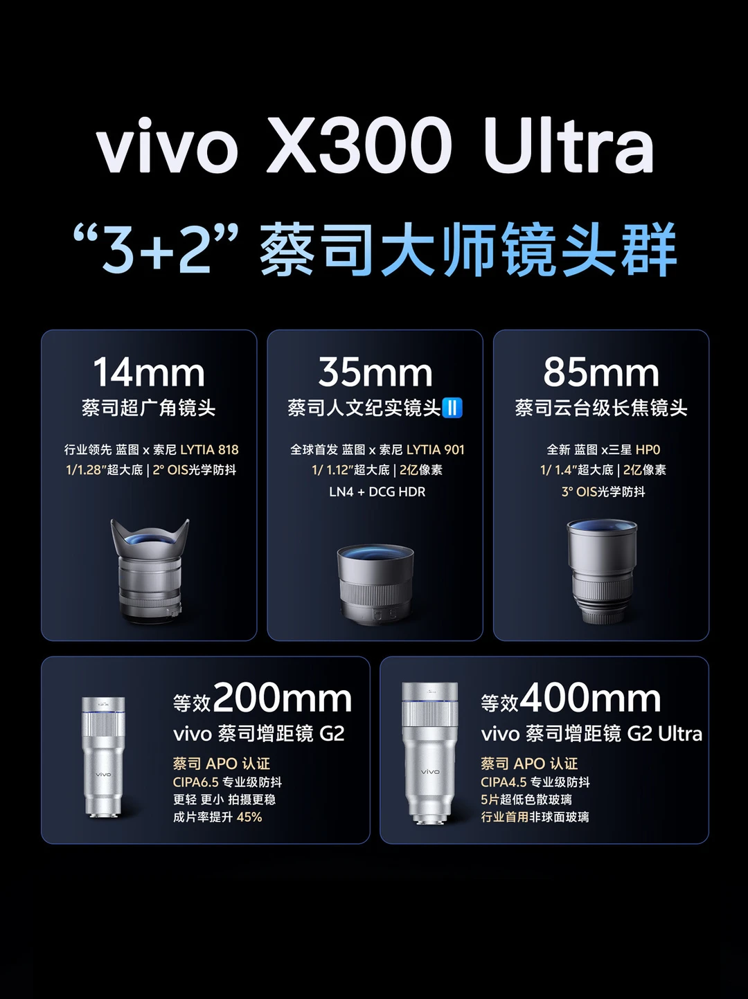 📸更夸张的是适配400mm 与 200mm 蔡司增距镜,手机直接实现相机级长焦,尤其是这个400mm的蔡司增距镜G2 Ultra,以前只在相机上见到,vivo却把它给到了手机,诚意满满!