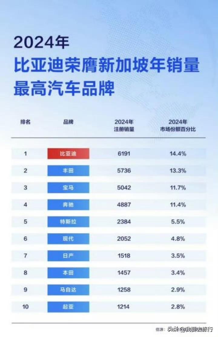 自从进入春天,自驾出行的人是越来越多,不管是国内还是国外,新能源汽车的海外市场占有是越来越多,在马路上基本一眼望去就是满眼的绿色车牌。刷到最新的新加坡销冠数据,国产新能源比亚迪再次霸占榜首,市占率 22.2%,每 7 辆新车就有 1 辆是它!作为旅游爱好者,真心觉得新能源是未来出行趋势。
