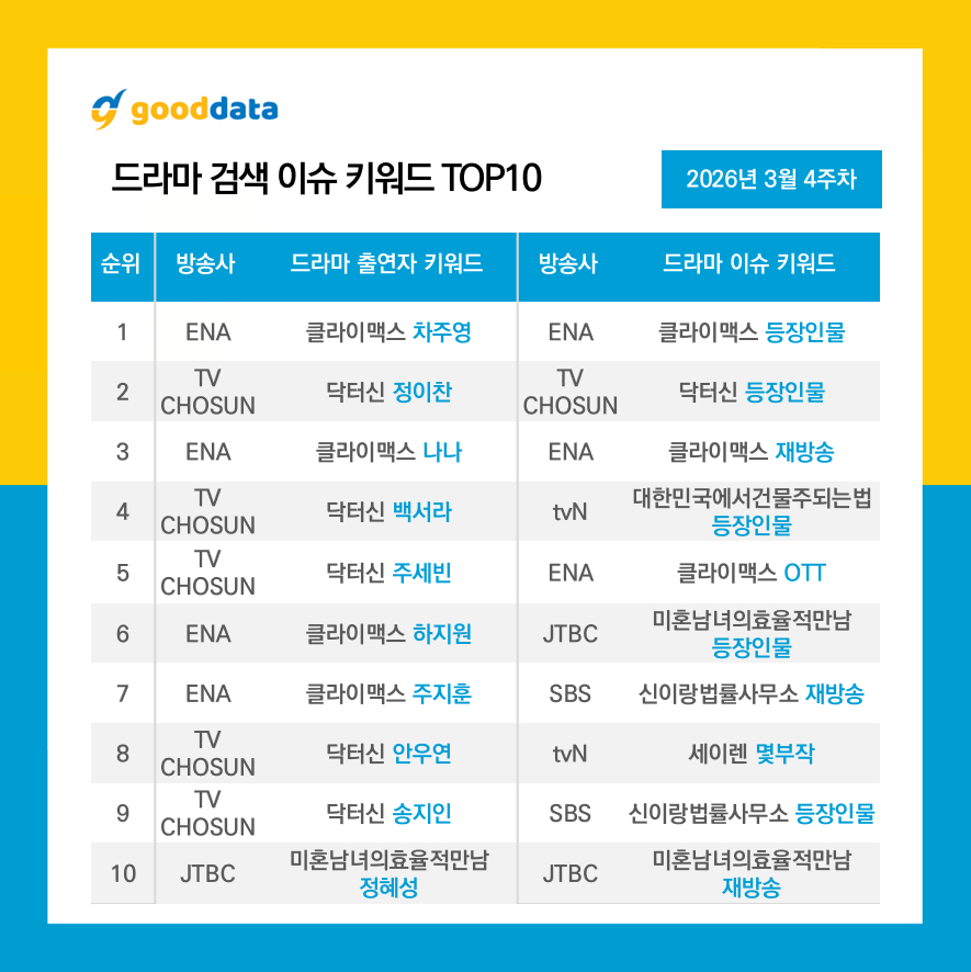 GOODDATA公布2026年3月第4周TV-OTT搜索榜TOP10、TV-OTT出演者搜索关键词TOP10、TV-OTT搜索关键词TOP10