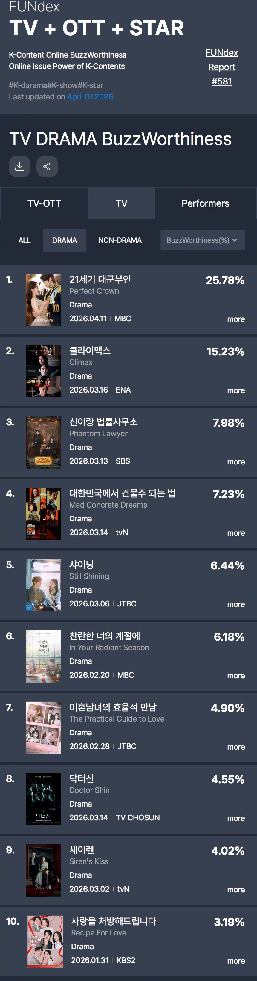 GOODDATA公布2026年4月第1周电视剧热度话题性排行。1.韩剧21世纪大君夫人 25.78%2.韩剧权欲之巅 15.23%3.神与律师事务所 7.98%4.在大韩民国成为屋主的方法 5.韩剧依然闪亮 6.韩剧在你灿烂的季节 7.韩剧未婚男女的效率恋爱 8.申医生9.魔女之吻 10.爱情处方签