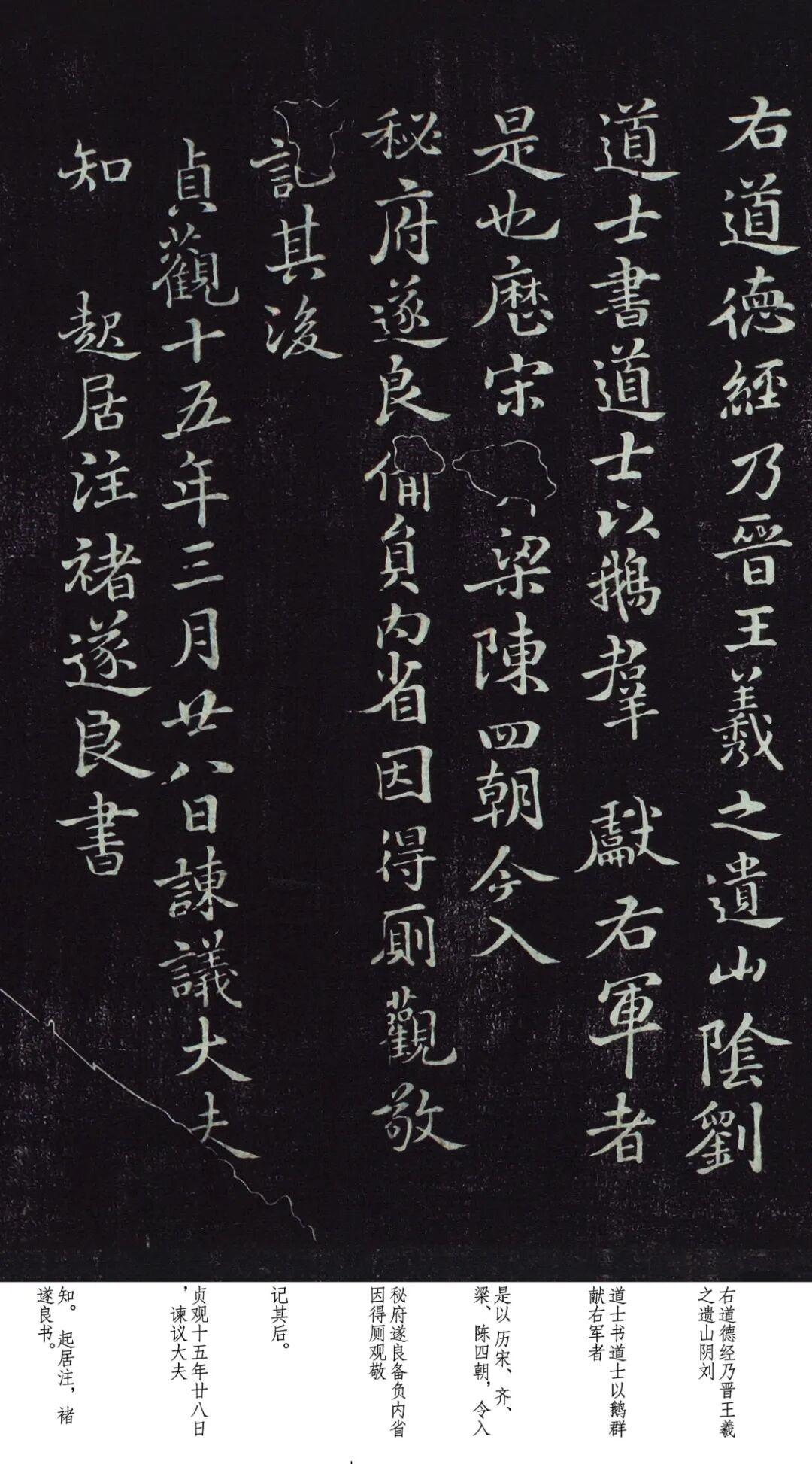 此卷的卷尾,有一段褚遂良题跋,写道:“右道德经乃晋王羲之遗山阴刘道士书,道士以鹅群献右军者是也……令入秘府遂良内省因得厕观敬记其后”,褚遂良对于“王书”极为熟悉,生平鉴定从而出错。
