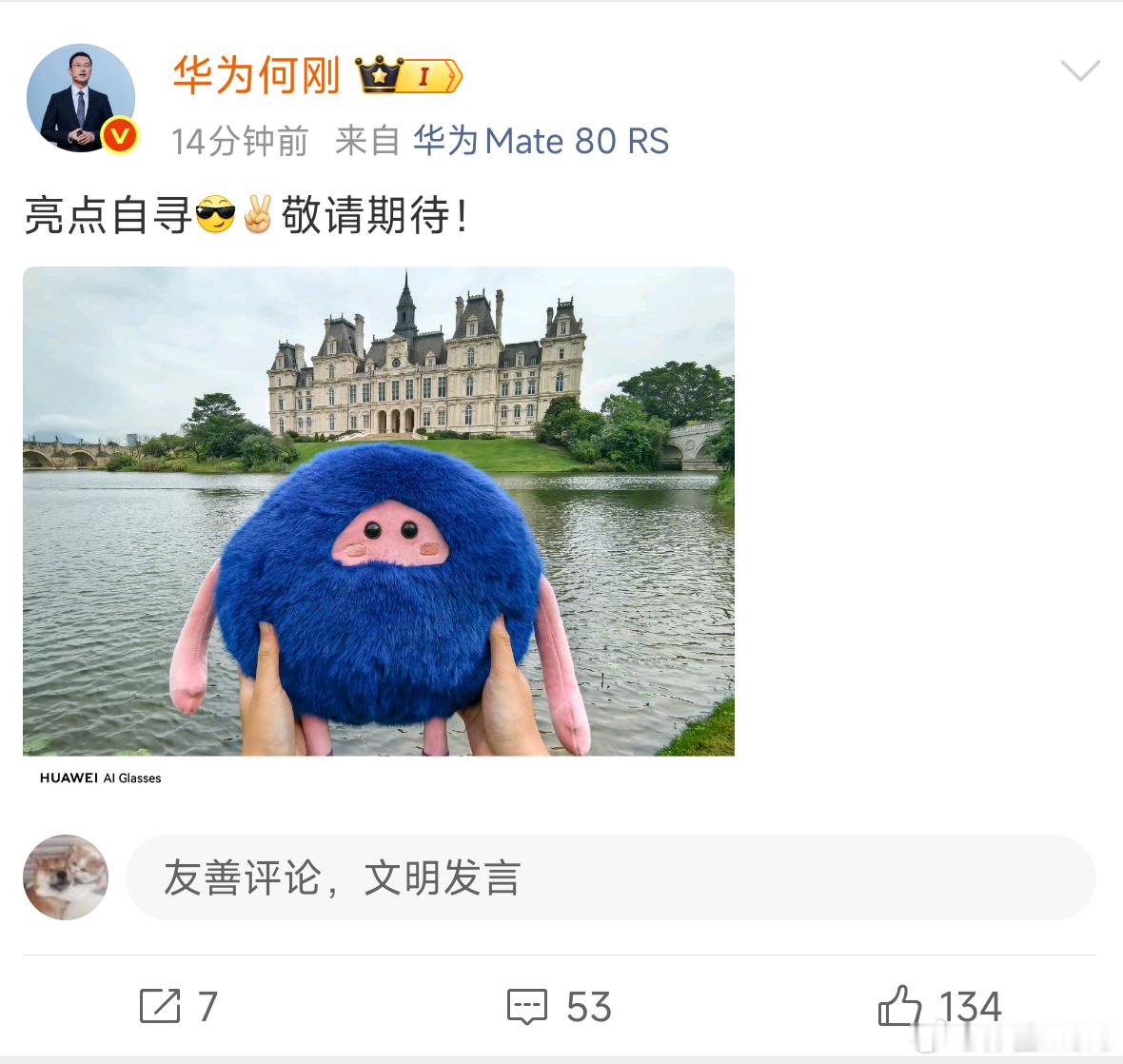 华为将发布AI眼镜HUAWEI AI Glasses也要来了,何刚晒出来的应该是用HUAWEI AI Glasses拍摄的照片。非常棒的华为AI眼镜带给大家。