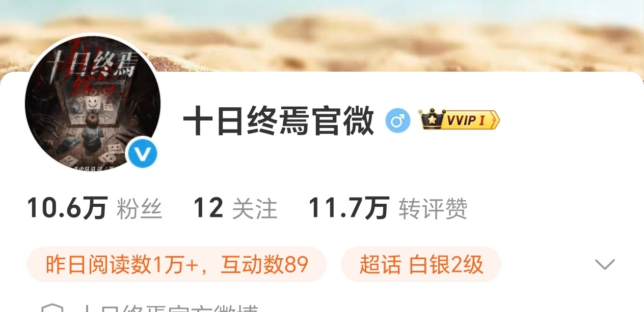 十日终焉官博刚开5小时,已经涨粉16.5万了,真的太牛了,这是很多剧播到完结都不一定有的数字,作为对比ip本身官博运营好几年才10.6万粉丝。感觉肖战作为顶流的影响力真的越来越强大,在《藏海传》爆剧以后会时刻关注他每一部作品的剧粉越来越多了。十日终焉官微 用户1231
