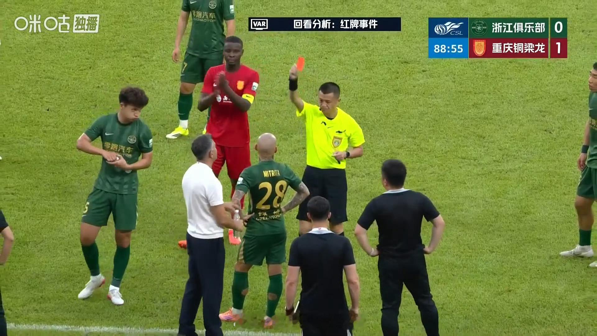 中足联官方发布处罚公告,中超联赛第4轮,浙江队球员米特里策实施暴力行为,在无球状态下拉拽重庆铜梁龙队李镇全的头发,裁判员出示红牌将其罚令出场。米特里策在离场过程中,脚踢冰桶及有联赛广告妆点的侧墙。中足联对浙江队球员米特里策予以停赛4场罚款人民币4万元。