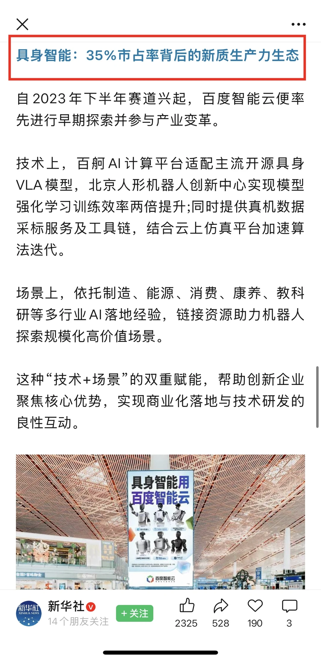 在具身智能赛道里,根据Omdia的数据,百度智能云在中国具身智能AI云服务市场占到35%的份额,排名第一。