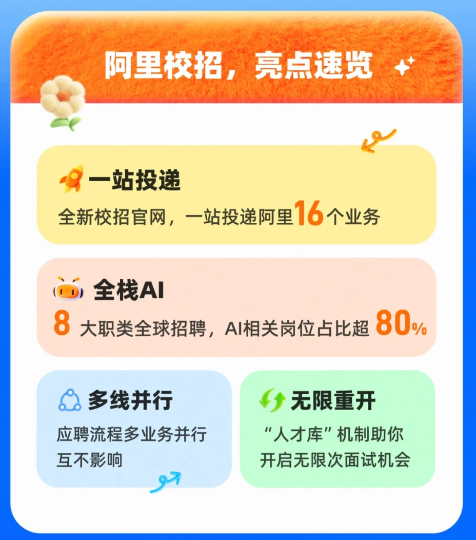 对应届毕业生而言,本次招聘体验也更加友好:校招官网全面升级,支持16个业务一站式投递;流程完成进一步优化,多条业务线可同时推进,互不影响。