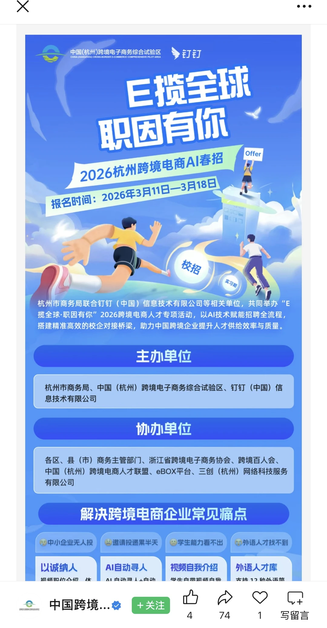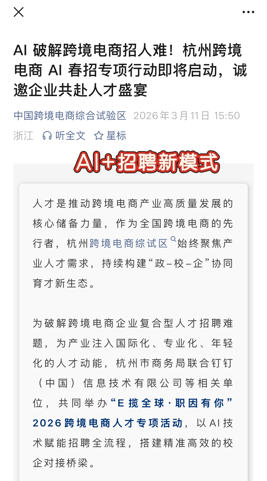 刚好看到钉钉和杭州市商务局在搞跨境电商的AI春招,感觉挺戳人的。不是那种硬邦邦的官方招聘活动,更像是在帮行业解决痛点: