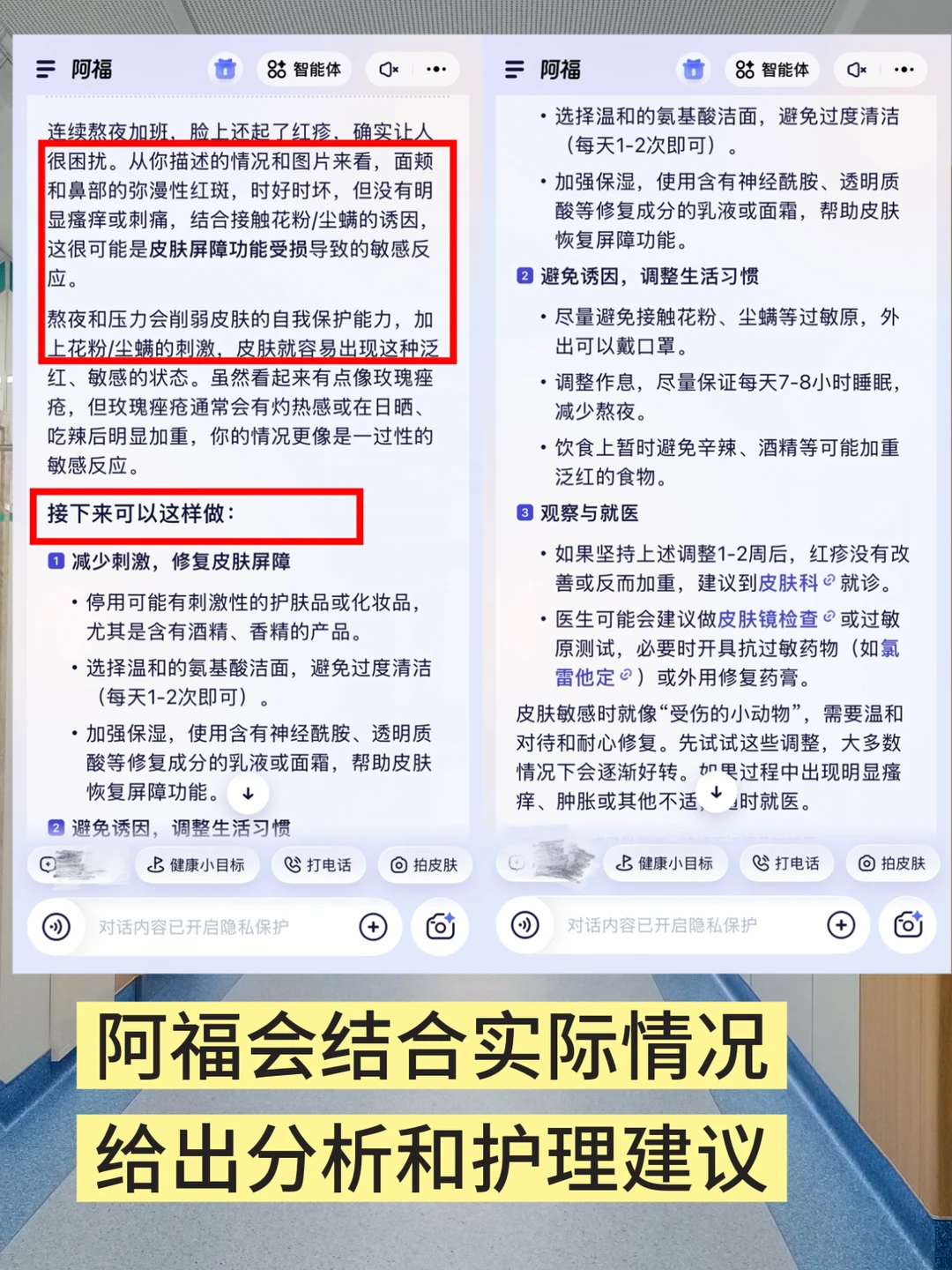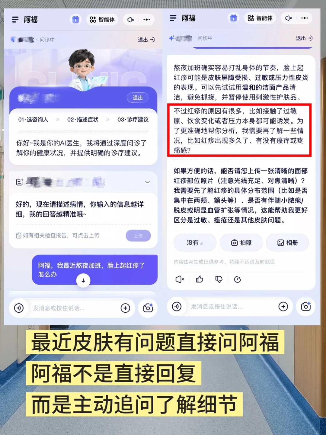 “最近熬夜加班,脸上起红疹,怎么办?”这个问题抛给阿福,它不着急给我回复,而是想了解更多细节,开始问我问题: