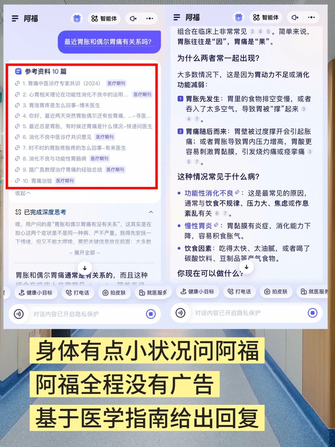 结合这些信息,阿福会给出分析和护理方法,还有什么情况需要就医,我这心里就有底了。这个过程,很像去皮肤科就诊,阿福的👨⚕️思维很强,回答中也不会混入广告。