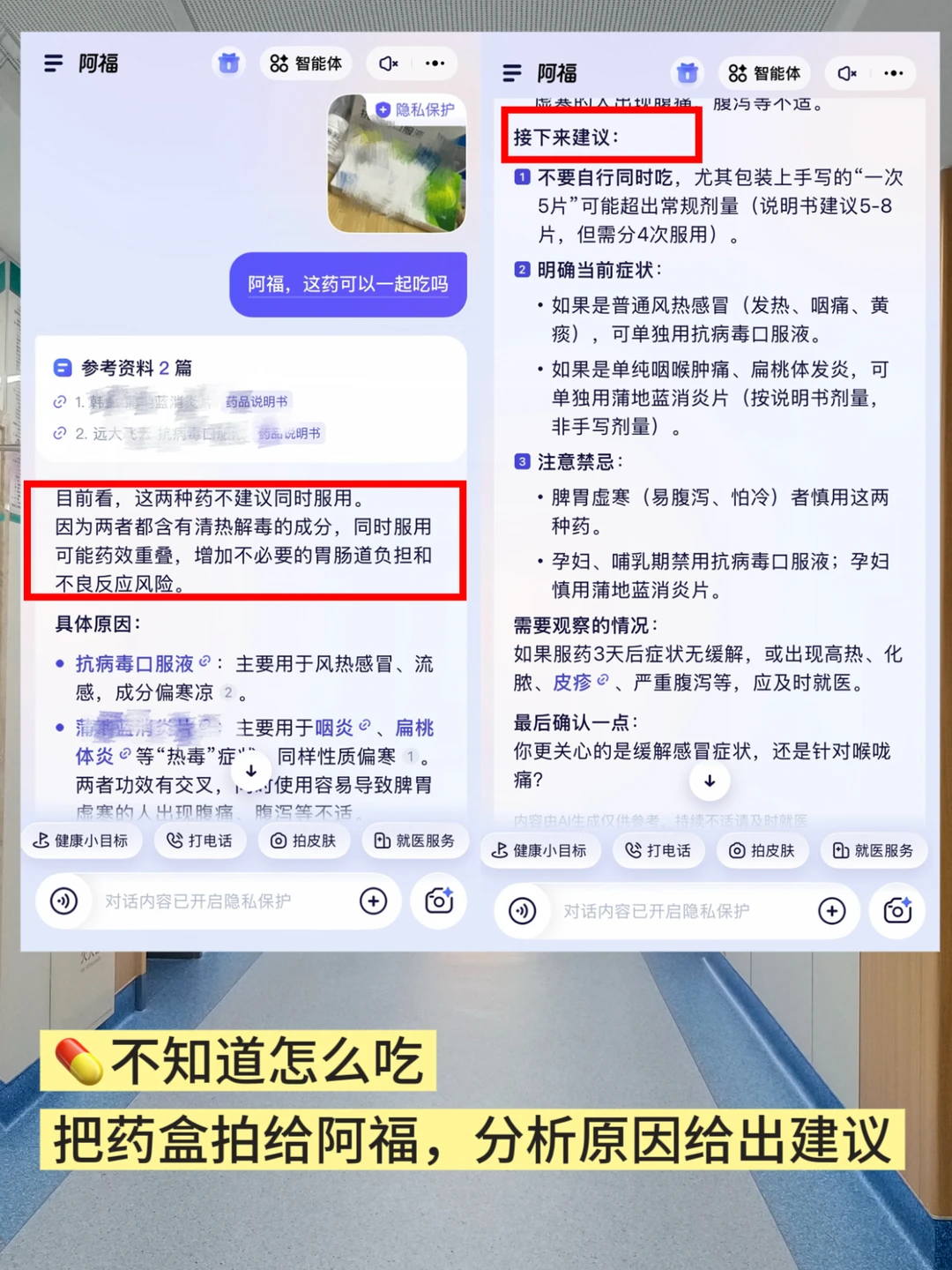 从医院开了一堆药,或者家里药箱翻出个药盒,怎么吃、一天几次、饭前还是饭后、有什么禁忌,完全记不清。把药盒拍给阿福,所有用药说明一目了然,比翻说明书还快。