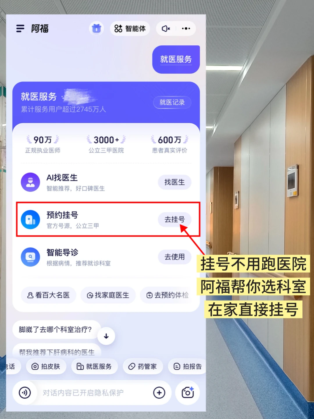 从咨询、预约挂号到支付,在阿福这一个app内就能搞定。因为阿福接入了5000多家医院,还对接了国家医保局系统,支付时直接能走医保,不要太方便!