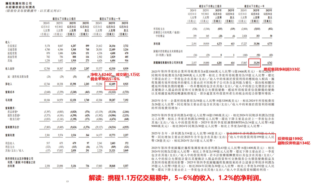 这万亿规模里,超过95%都是直接流向酒店、航司、景区等供应商,携程真正能计入自己收入的,是624亿左右,佣金率大概5%多一点。