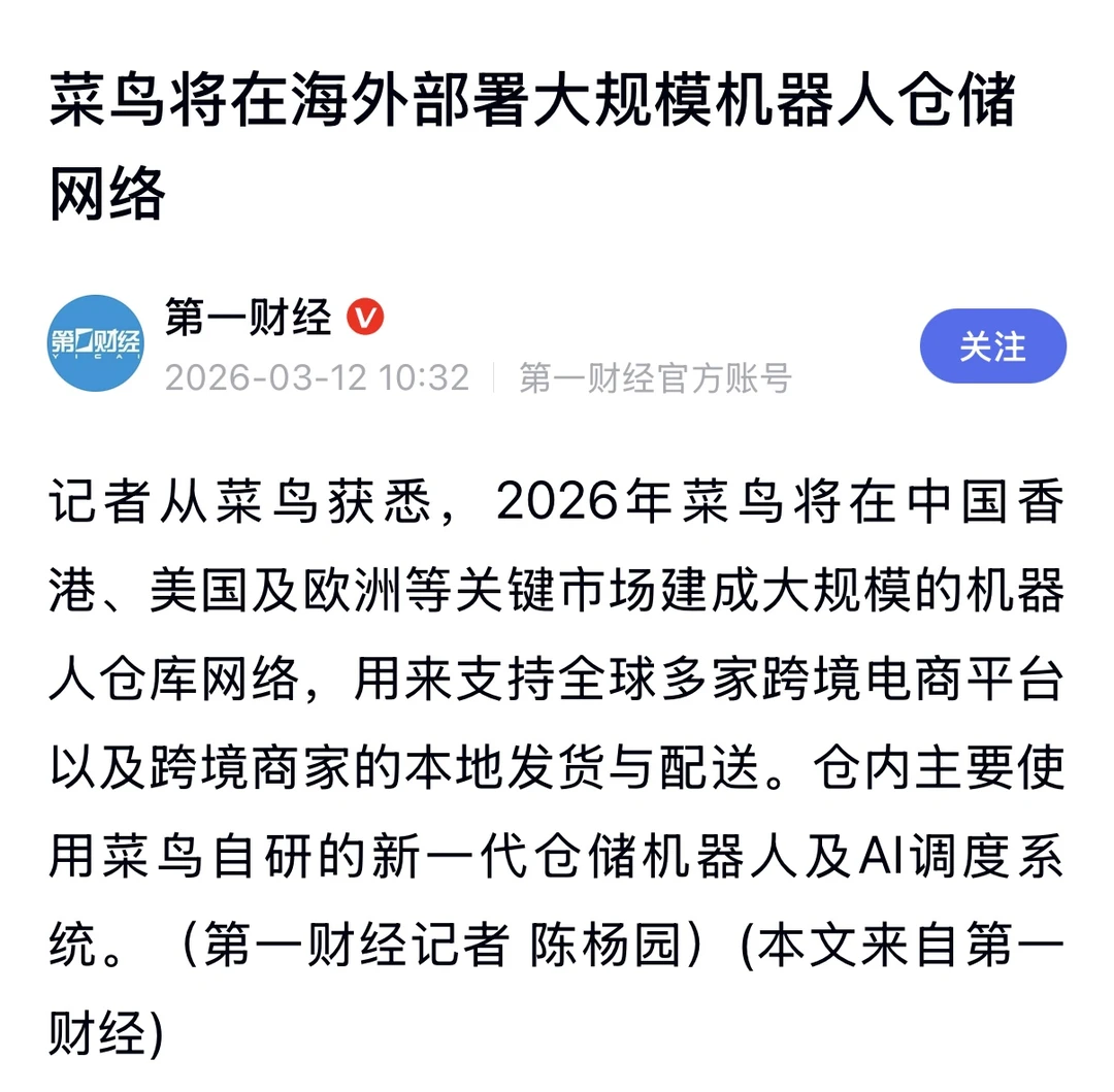 菜鸟这次在香港、欧洲、美国部署机器人仓,本质上就是把AI调度系统和仓储机器人嵌进海外仓网络,让仓库自己去调度、自己去分配任务。