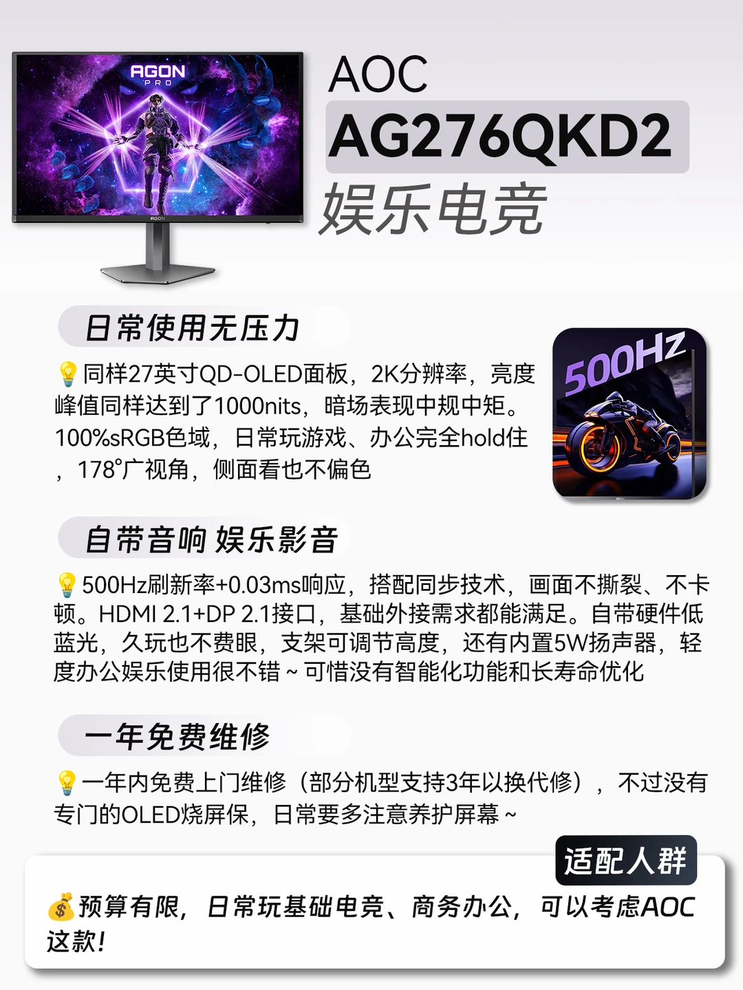 🤔预算有限,日常玩基础电竞、商务办公,可以考虑AOC这款!