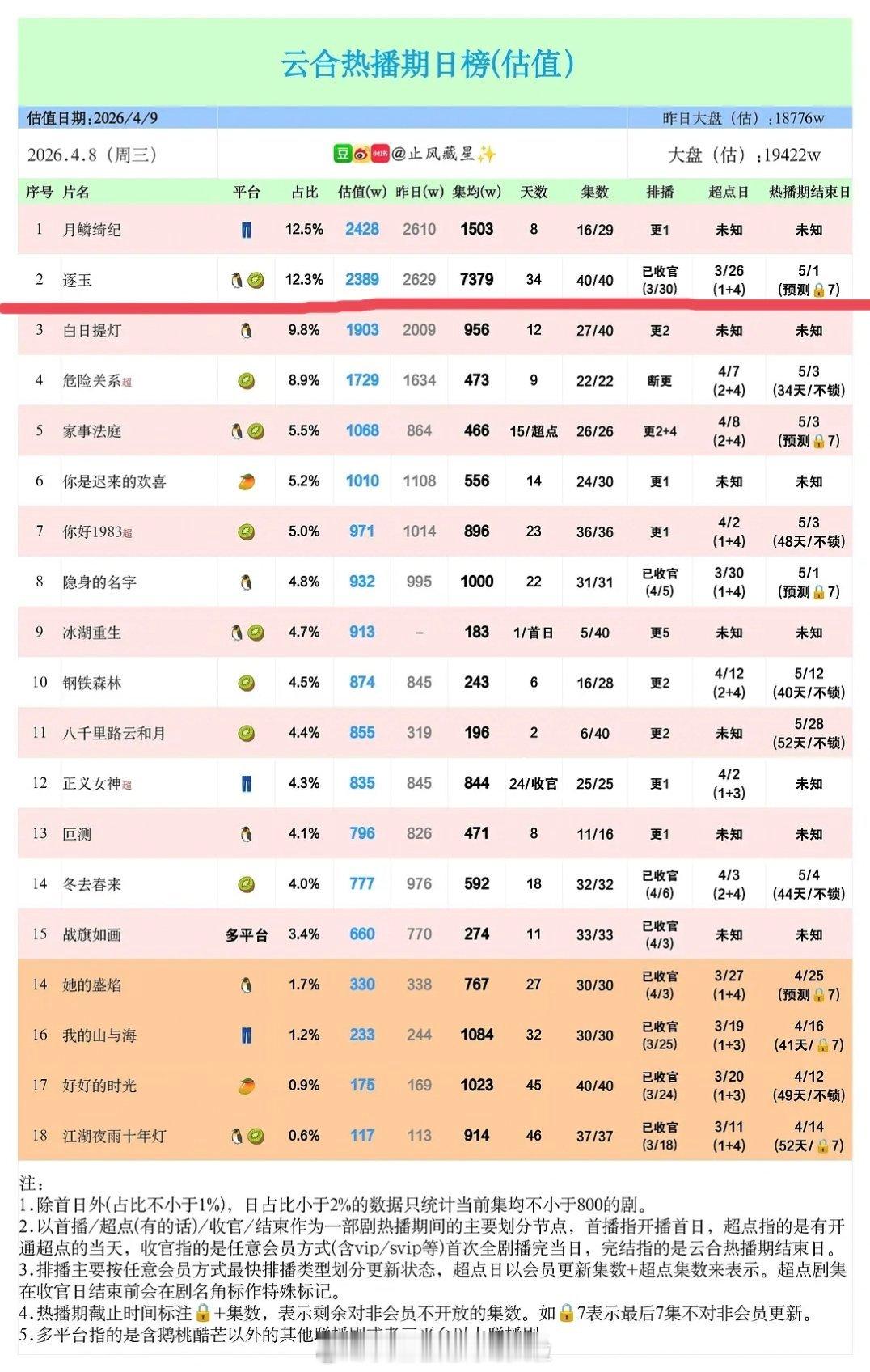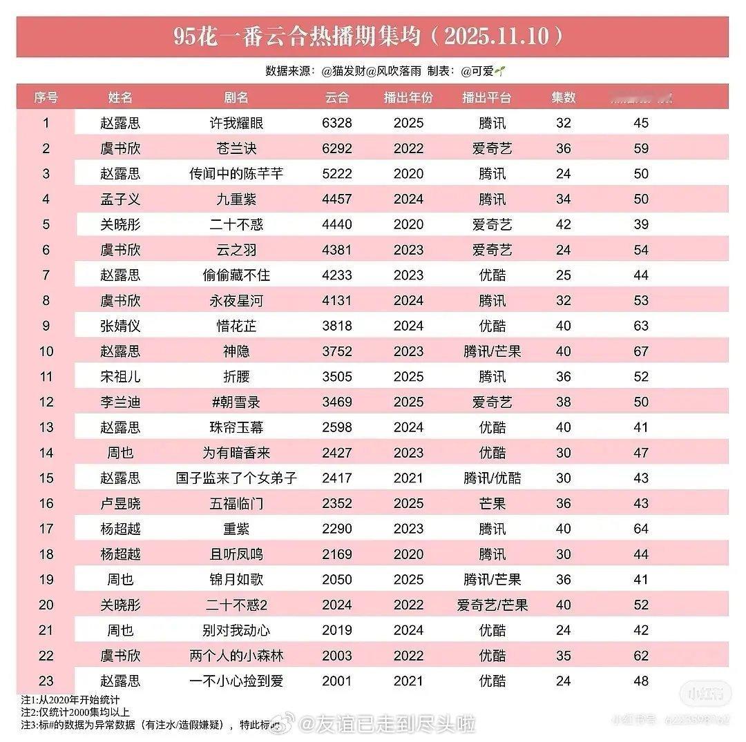 田曦薇登顶95花网播实绩第一了《逐玉》云合热播期集均7379,之前95花的最高记录是赵露思《许我耀眼》6328