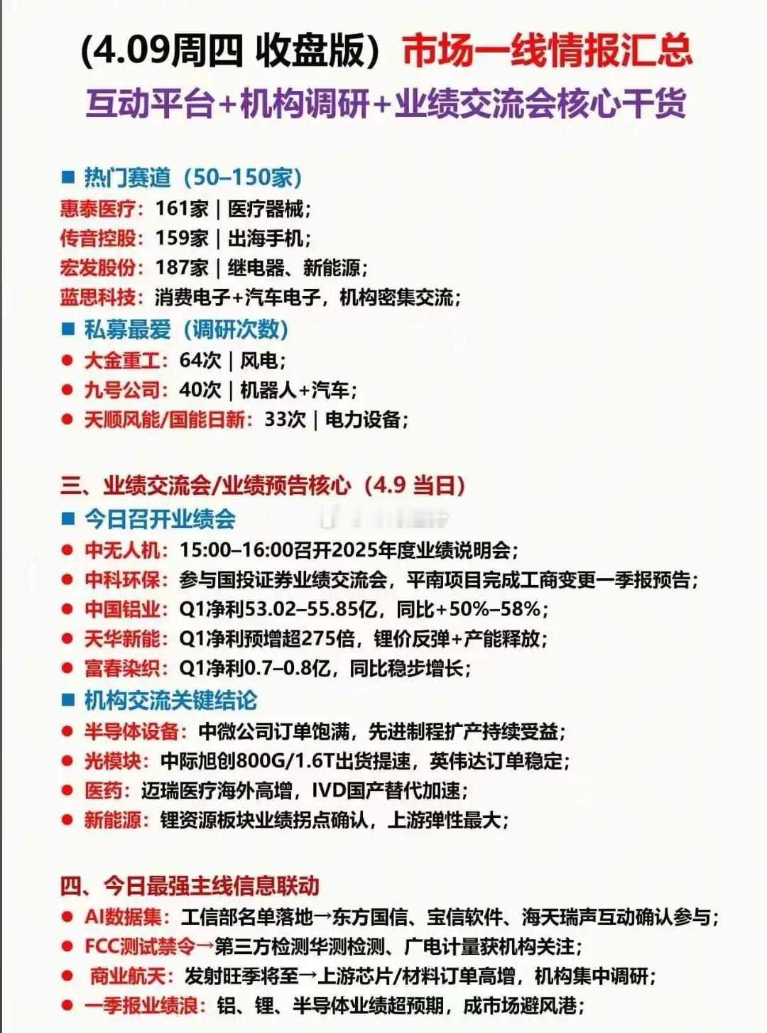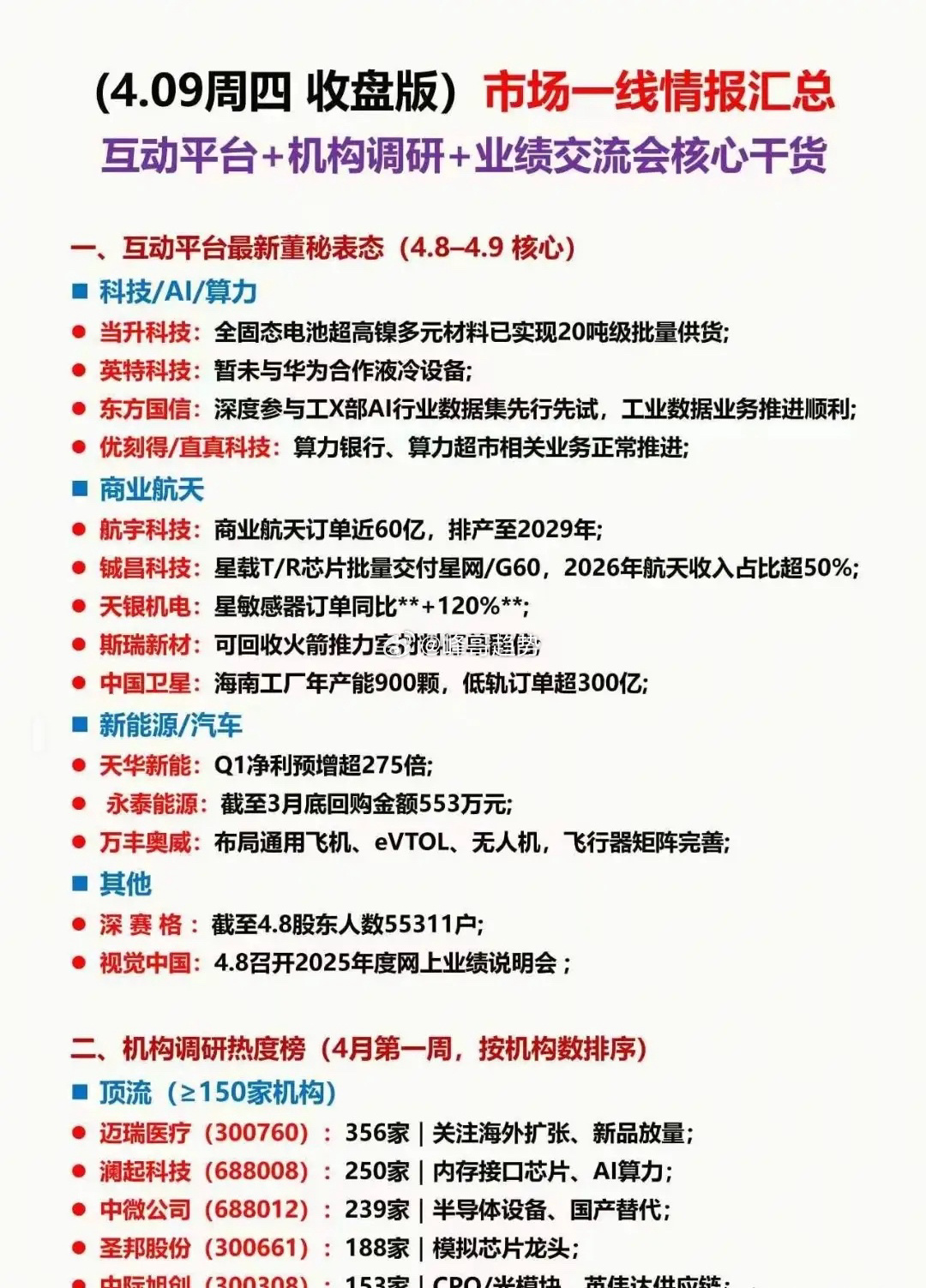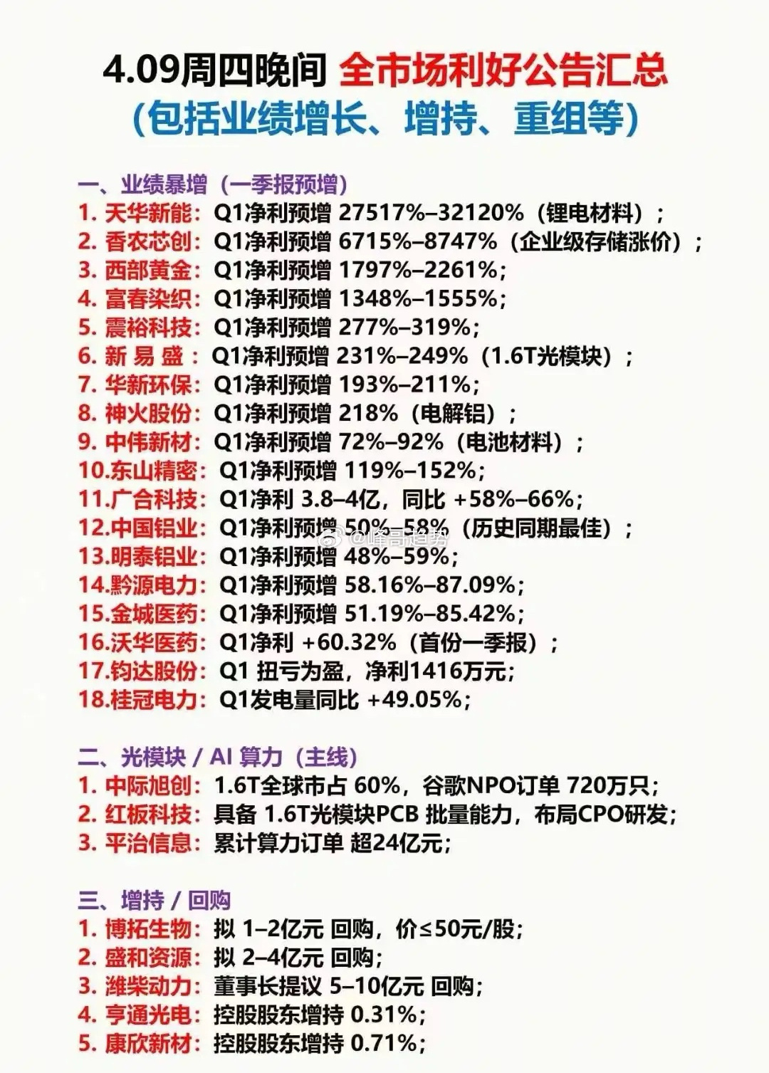 晚间利好密集落地,天华新能Q1净利预增超275倍,香农芯创、富春染织等业绩暴增;中际旭创1.6T光模块全球市占60%,谷歌订单超720万只;荣盛石化、山东黄金等大额增持回购,市场信心持续提振。机构调研热度聚焦AI算力、半导体设备,澜起科技、中微公司、中际旭创获超百家机构扎堆调研,一季报业绩超预期的铝、锂、半导体板块成为市场避风港,把握算力主线与业绩双轮驱动的投资机会!⚠️ 风险提示:以上内容仅为市场信息梳理,不构成任何投资建议,股市有风险,投资需谨慎。A股美以或对伊朗采取割草模式