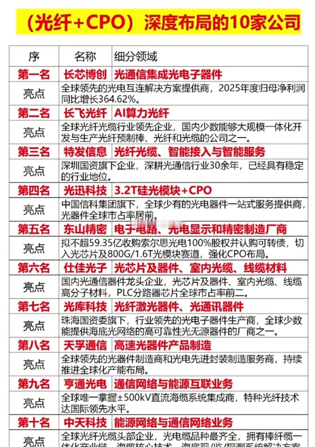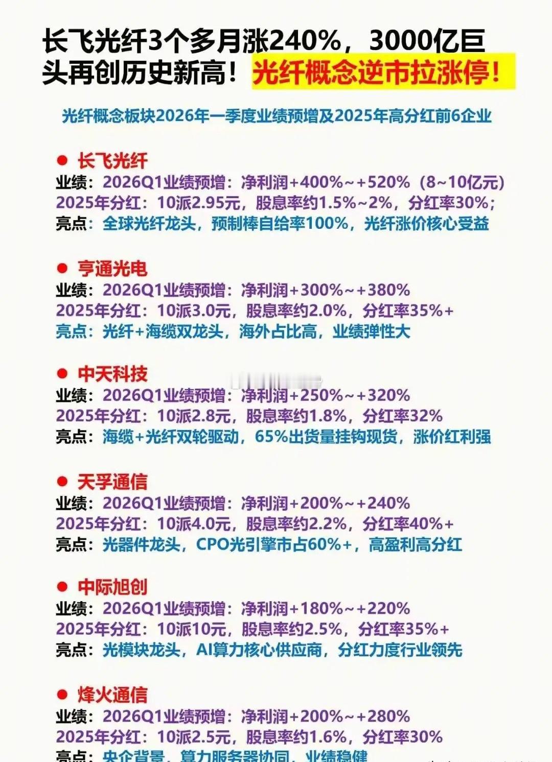 算力主线彻底爆发,光纤/CPO领涨,一季报业绩利好浪潮来袭!昨日A股算力主线全面走强,光纤、CPO、液冷服务器等赛道多点开花,汇源通信5连板、长飞光纤涨停,光迅科技、天通股份等多股封板,光纤价格持续暴涨带动产业链业绩集体预增,长飞光纤Q1净利预增超400%。