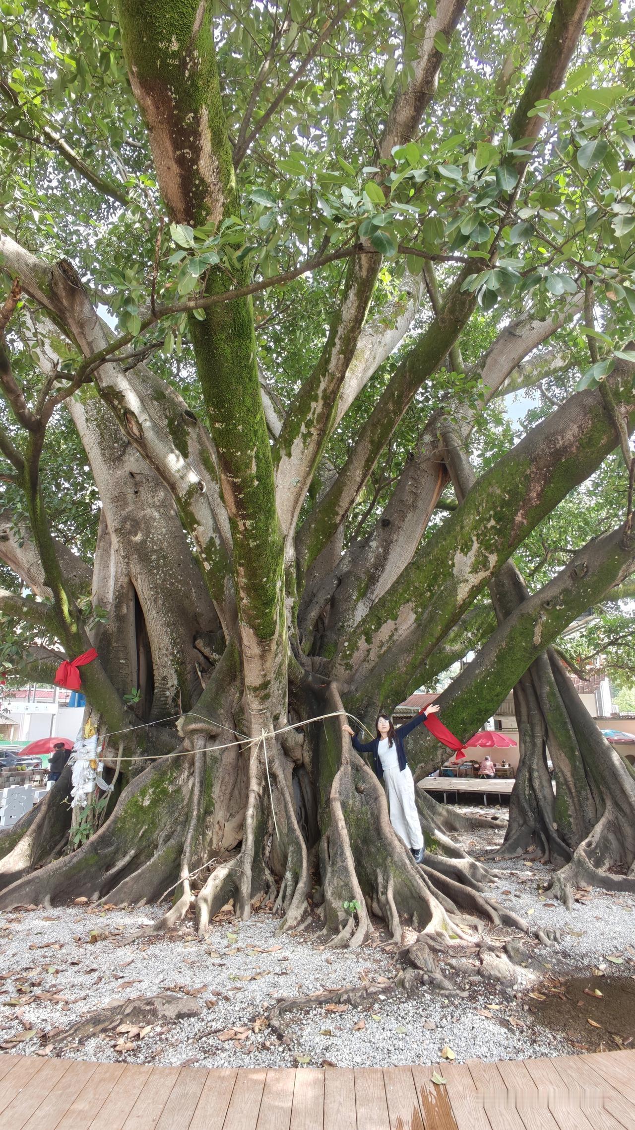 路过潞江坝,偶然发现路牌指示,有一颗亚洲第一大榕树树。看到榕树的第一眼,实在很震撼。这是见过的最粗大的一颗,位于保山市潞江镇丙闷村,树龄700年。走近这棵已有700余年树龄的榕树,我感到无比震撼。树高28米,胸围达28.48米,胸径9.07米,规模之巨大让人难以想象。大树的枝干紧密地交错在一起,形成了一个庇护我们众人的穹顶,数不清的气根从高处垂下,仿佛时间在这里凝固。指尖轻轻触摸到那粗糙的树皮,能够感受到岁月在指尖流淌的坚定与温暖。 站在这棵树旁,我感受到了一种从未有过的渺小感。无论我们身量多高、地位如何,在这棵植物面前,我们似乎都变得无比微小。微风轻拂,树叶沙沙作响,仿佛是整片森林在为我们低吟着古老的歌谣,诉说着悠久的过去。旁边有位老者在小店前守望,村子虽然宁静,偶尔还是能看到远道而来的游客,他们怀着对这棵大榕树的敬仰与好奇,纷纷驻足,静静欣赏这自然的奇迹。