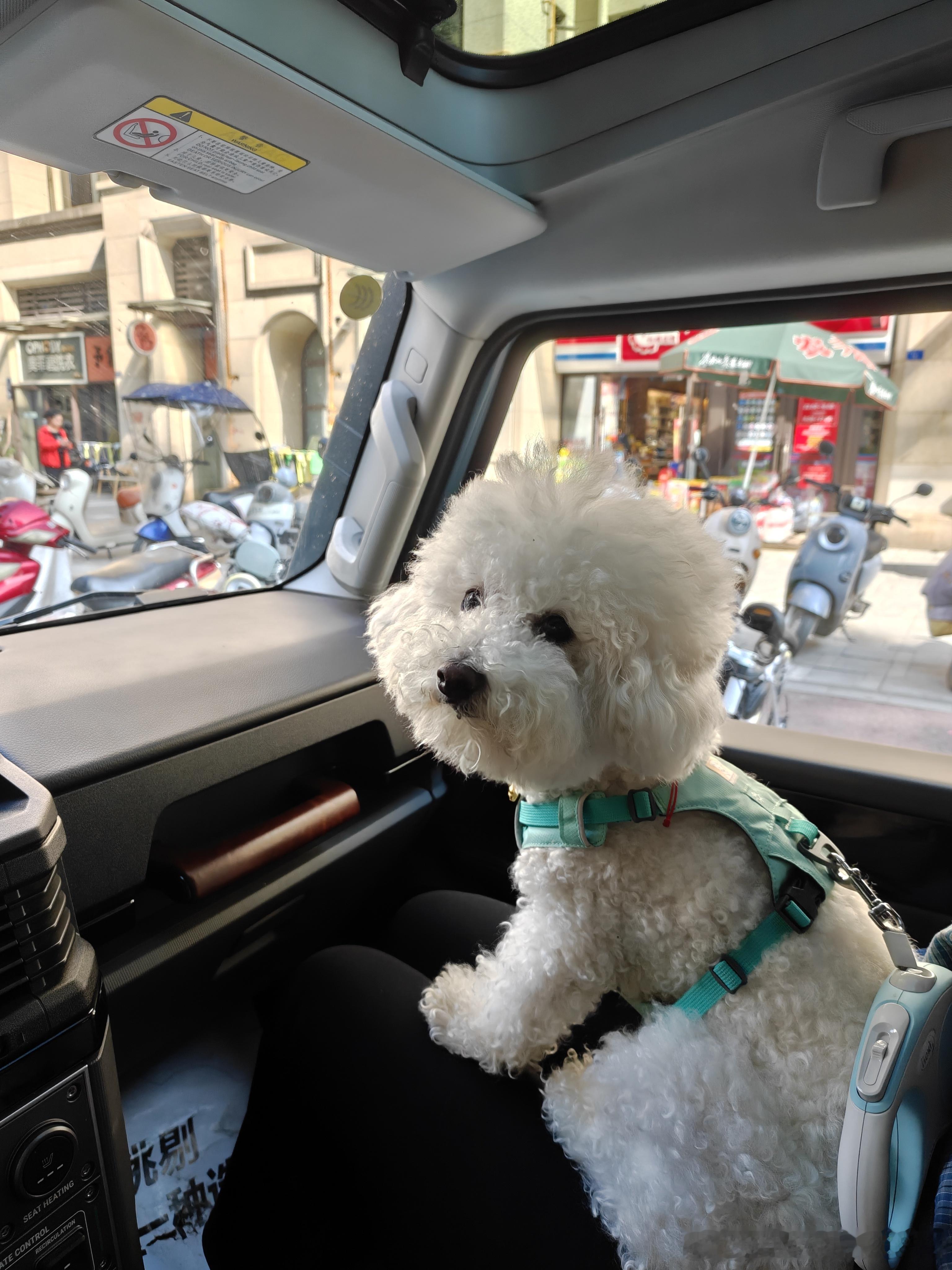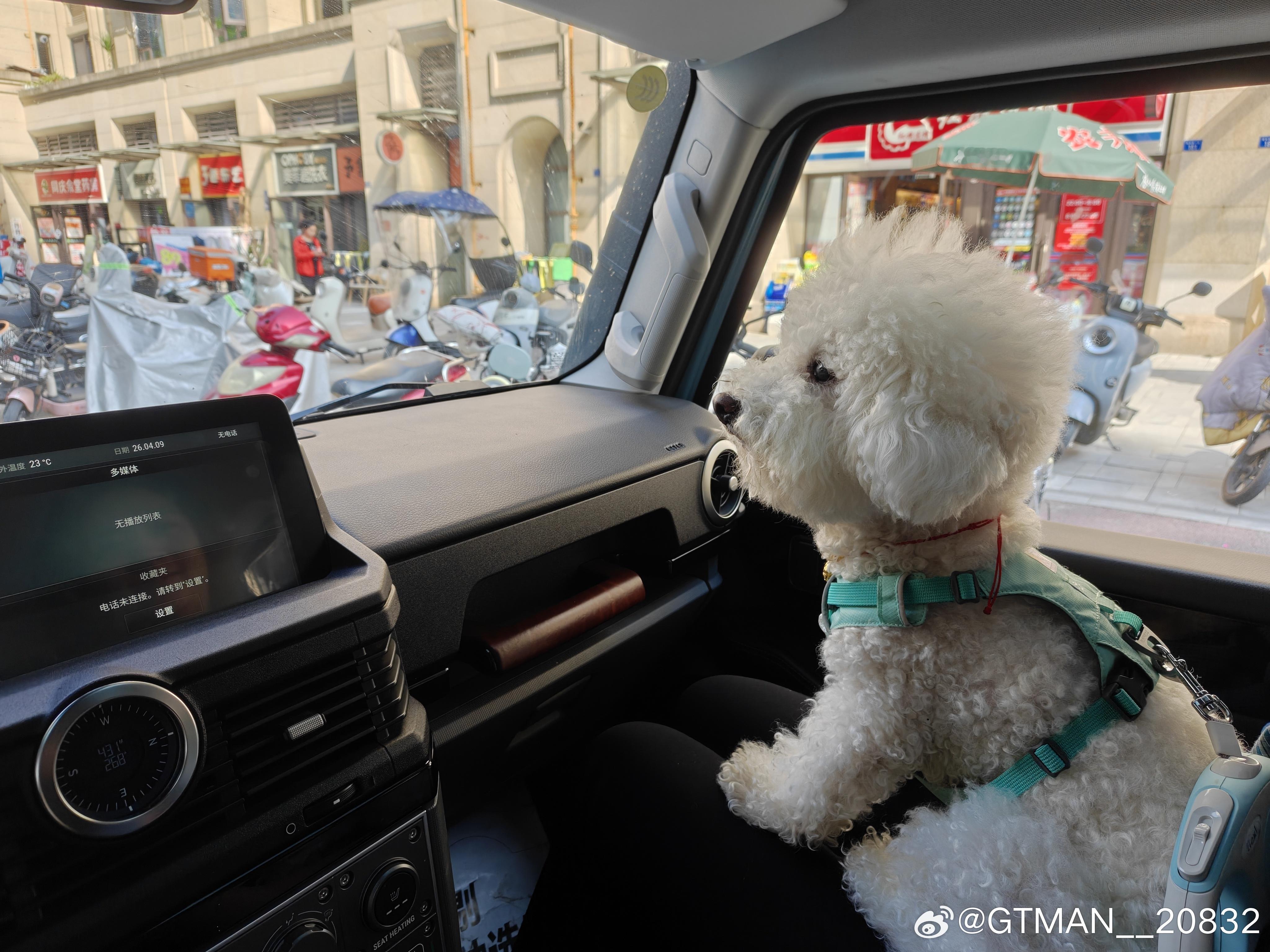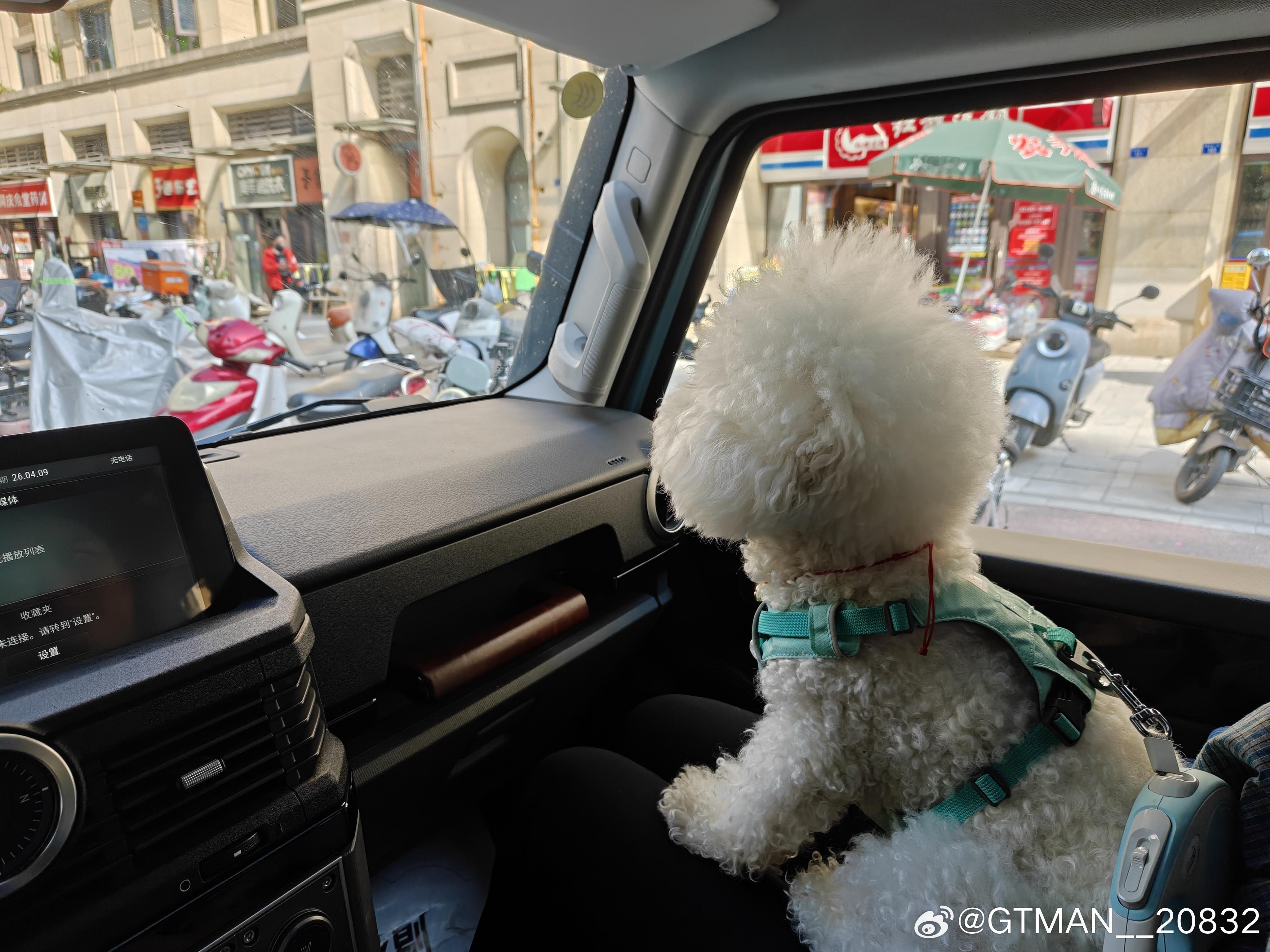 小狗第一次在车里坐着就能看见前面了,不用再站起来往旁边看了。掷弹兵这经典越野车的设计,能看见整个机盖,光视野就能带来很大的情绪价值。