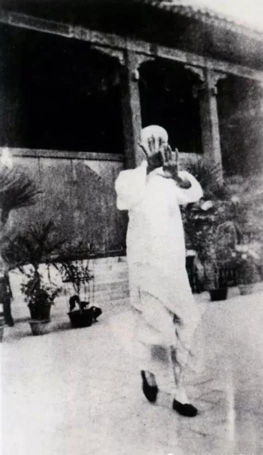 末代皇帝溥仪,在天津静园的庭院里,打着太极拳。
